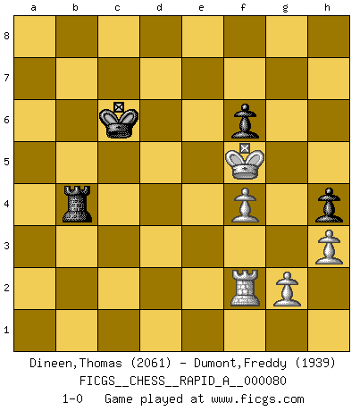 Last move : 1-0 2010 July 19 9:37:0 [Event "FICGS__CHESS__RAPID_A__000080"] [Site "FICGS"] [Date "2010.04.02"] [Round "1"] [White "Dineen,Thomas"] [Black "Dumont,Freddy"] [Result "1-0"] [WhiteElo "2061"] [BlackElo "1939"] 1.d4 Nf6 2.c4 c6 3.Nc3 d5 4.Nf3 e6 5.e3 Nbd7 6.Bd3 dxc4 7.Bxc4 b5 8.Bd3 a6 9.e4 c5 10.d5 c4 11.dxe6 fxe6 12.Bc2 Qc7 13.O-O Bb7 14.Ng5 Nc5 15.e5 Qxe5 16.Re1 Qd6 17.Qxd6 Bxd6 18.Be3 Nd3 19.Bxd3 cxd3 20.Rad1 Ng4 21.h3 Nxe3 22.Rxe3 Bf4 23.Rxe6+ Kf8 24.Rb6 Bxg5 25.Rxb7 Rd8 26.Ne4 Be7 27.Ra7 h5 28.Rxa6 h4 29.Ra5 Rh5 30.a4 Re5 31.f3 Bf6 32.Nxf6 gxf6 33.Rxb5 Rxb5 34.axb5 Rd6 35.Kf2 Ke7 36.Ke3 Rd5 37.Rxd3 Rxb5 38.b3 Ke6 39.Kd4 Rg5 40.Rd2 Kd6 41.f4 Rg3 42.b4 Kc6 43.Ke4 Rb3 44.Kf5 Rxb4 45.Rf2 1-0 This chess game has been lost on time (started : 2010.04.02 17:9:19) Queen's pawn game Kingside Castling by player White (move 13) 10 pieces endgame at move 37 : White KRPPPP , Black KRPP WHITE : King + 1 Rook 4 Pawns BLACK : King + 1 Rook 2 Pawns 9 pieces endgame at move 44 : White KRPPP , Black KRPP WHITE : King + 1 Rook 3 Pawns BLACK : King + 1 Rook 2 Pawns Player White won this chess game. Follow this game move after move (download)Winning isn't everything... but losing is nothing. (Mednis) Im Fernschach kannst du während dem Spiel rauchen. (John Christen Knudsen) Es muy difícil jugar en contra de la teoría de Einstein. - en su primera derrota en contra de Fischer (Mikhail Tal) Il (Jacob Murray) ne joue pas pour le bon coup, mais pour le meilleur. (Eloi Relange) No enterprise is more likely to succeed than one concealed from the enemy until it is ripe for execution. (Niccolo Machiavelli)