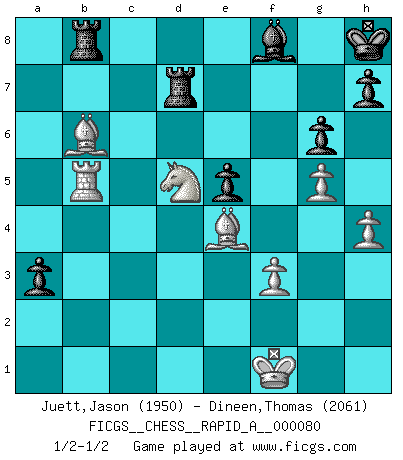 Last move : 1/2-1/2 2010 August 14 2:28:20 [Event "FICGS__CHESS__RAPID_A__000080"] [Site "FICGS"] [Date "2010.04.02"] [Round "1"] [White "Juett,Jason"] [Black "Dineen,Thomas"] [Result "1/2-1/2"] [WhiteElo "1950"] [BlackElo "2061"] 1.d4 Nf6 2.c4 g6 3.Nc3 Bg7 4.e4 d6 5.Nf3 O-O 6.Be2 e5 7.O-O Nc6 8.d5 Ne7 9.Ne1 Ne8 10.Nd3 f5 11.Bd2 fxe4 12.Nxe4 Nf6 13.f3 Nf5 14.Ndf2 c6 15.Bd3 cxd5 16.cxd5 Nxe4 17.Nxe4 Qb6+ 18.Rf2 Qxb2 19.Rc1 Qb6 20.Rb1 Qc7 21.Rc1 Qf7 22.h3 Kh8 23.Qb3 b6 24.Qa3 Qxd5 25.Rc7 a5 26.Ng5 Be6 27.g4 Nd4 28.Be4 Qxa2 29.Qxd6 Nb5 30.Qxe6 Qxe6 31.Nxe6 Nxc7 32.Nxc7 Ra7 33.Nd5 b5 34.Be3 Raf7 35.Rb2 Rb8 36.Bb6 a4 37.Rxb5 Bh6 38.Kf1 Rd7 39.h4 Bf8 40.g5 a3 1/2-1/2 King's Indian : Orthodox, Aronin-Taimanov variation (Yugoslav attack / Mar del Plata variation) Kingside Castling by player Black (move 5) Kingside Castling by player White (move 7) This chess game ended in a draw. Follow this game move after move (download)Chess is a terrible game. If you have no center, your opponent has a freer position. If you do have a center, then you really have something to worry about ! (Siegbert Tarrasch) Pläne sind die Träume des Verständigen. (Ernst Freiherr von Feuchtersleben) Yo creo que el Ajedrez posee una magia que es también una ayuda en la edad avanzada. Una rodilla reumática es olvidada durante una partida de Ajedrez y otros eventos pueden parecer algo sin importancia comparada a una catástrofe en el tablero de Ajedrez. (Vlastimil Hort) A ce moment-là, je menaçais de comprendre la position ! (Clément L'Heureux) In fact if nothing is done against this teddy bear, hereby I announce that I would quit chess, rapid chess, blitz chess, postal chess, email chess, server chess and correspondence chess I will then switch to a table game where teddy bears aren't going to be seen for a while, like Poker, or Roulette, all 18+ games. (Elmer Valderrama)