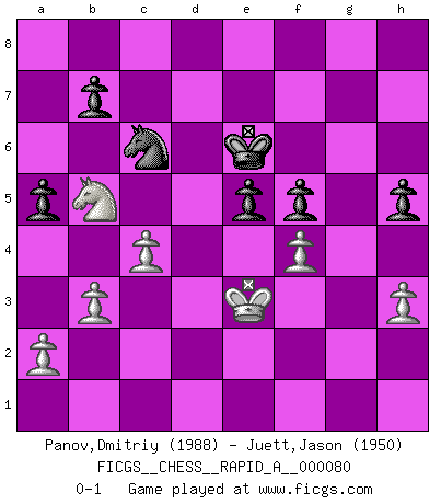 Last move : 0-1 2010 September 4 11:7:39 [Event "FICGS__CHESS__RAPID_A__000080"] [Site "FICGS"] [Date "2010.04.02"] [Round "1"] [White "Panov,Dmitriy"] [Black "Juett,Jason"] [Result "0-1"] [WhiteElo "1988"] [BlackElo "1950"] 1.e4 c5 2.c3 d5 3.exd5 Qxd5 4.d4 Nf6 5.Nf3 Bg4 6.Be2 e6 7.O-O Nc6 8.Be3 cxd4 9.Nxd4 Bxe2 10.Qxe2 Be7 11.Nd2 O-O 12.Nxc6 Qxc6 13.Rfe1 Rfd8 14.Nf3 Nd5 15.Bd4 Nc7 16.Ne5 Qe8 17.Nd3 Nb5 18.Be5 Nd6 19.h3 Rac8 20.Rad1 Nf5 21.Nf4 Rxd1 22.Rxd1 Rd8 23.Rxd8 Qxd8 24.b3 Bd6 25.Qd3 Qc7 26.Bxd6 Qxd6 27.Qxd6 Nxd6 28.c4 e5 29.Nd5 f6 30.f3 Kf7 31.Kf2 Ke6 32.g4 f5 33.Ke3 g6 34.Nc3 Nf7 35.Nb5 a5 36.Nc3 Nd8 37.Nb5 h5 38.gxf5+ gxf5 39.f4 Nc6 0-1 This chess game has been lost on time (started : 2010.04.02 17:9:19) Sicilian : Alapin's variation (2.c3) Kingside Castling by player White (move 7) Kingside Castling by player Black (move 11) Player Black won this chess game. Follow this game move after move (download)A strong memory, concentration, imagination, and a strong will is required to become a great Chess player. (Bobby Fischer) Ivan Sokolov treibt mich als Beifahrer an mit go Loeky go - . (Loek van Wely) Las leyes del Ajedrez no permiten una libre elección: tienes que mover quieras o no. (Emanuel Lasker) Les Echecs mettent en conflit, non pas deux intelligences, mais deux volontés. (Lasker) If computers get too powerful, we can organize them into committees. That'll do them in. (Anonymous)