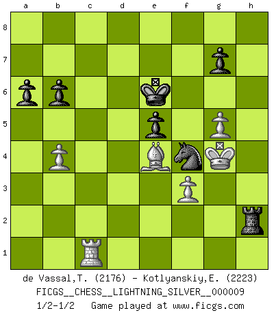 Last move : 1/2-1/2 2010 April 2 21:46:23 [Event "FICGS__CHESS__LIGHTNING_SILVER__000009"] [Site "FICGS"] [Date "2010.04.02"] [Round "1"] [White "de Vassal,Thibault"] [Black "Kotlyanskiy,Edward"] [Result "1/2-1/2"] [WhiteElo "2176"] [BlackElo "2223"] 1.e4 c5 2.Nf3 d6 3.d4 cxd4 4.Nxd4 Nf6 5.Nc3 a6 6.Be3 e5 7.Nb3 Be6 8.f3 h5 9.Qd2 Nbd7 10.a4 Rc8 11.Be2 Be7 12.a5 h4 13.O-O O-O 14.Rfd1 Qc7 15.Bf1 Rfe8 16.Qf2 Nh5 17.Nc1 Nhf6 18.Kh1 Qc6 19.Qd2 Qc7 20.Bf2 Red8 21.N1a2 h3 22.g4 Qxa5 23.Nd5 Qxd2 24.Nxe7+ Kf8 25.Ng6+ fxg6 26.Rxd2 Ke7 27.Bxh3 d5 28.exd5 Bxd5 29.Bg2 Bxa2 30.Rxa2 Nb8 31.Rxd8 Rxd8 32.Bf1 Rd2 33.Bc5+ Ke6 34.Be3 Rxc2 35.Bd3 Rc6 36.Bxg6 Nd5 37.Bf5+ Kd6 38.Bd2 Rb6 39.g5 Nc6 40.Be4 Rb3 41.h4 Nf4 42.Bc3 Ne7 43.Ra3 Rb6 44.Ra1 Ned5 45.Bd2 Ke6 46.Rd1 Rb5 47.Rb1 Rb3 48.Kh2 b6 49.Kg3 Ne3 50.Bxe3 Rxe3 51.b4 Re2 52.h5 Nxh5+ 53.Kg4 Nf4 54.Rc1 Rg2+ 55.Kh4 Rh2+ 56.Kg4 1/2-1/2 Sicilian : Najdorf, Byrne (English) attack Kingside Castling by player White (move 13) Kingside Castling by player Black (move 13) This chess game ended in a draw. Follow this game move after move (download)Every Chess master was once a beginner. (Chernev) Ein Gewinn durch eine ungenaue Kombination, sei sie auch noch so vorzeigbar, erfüllt mich mit Schaudern. (Wilhelm Steinitz) Yo considero que Fischer es uno de los expertos mas grandes de aperturas de siempre. (Keith Hayward) Celui qui prend des risques peut perdre, celui qui n'en prend pas perd toujours. (Xavier Tartacover) However beautiful the strategy, you should occasionally look at the results. (Winston Churchill)