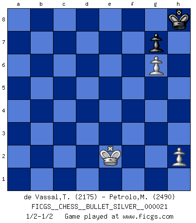 Last move : 1/2-1/2 2010 April 3 2:6:2 [Event "FICGS__CHESS__BULLET_SILVER__000021"] [Site "FICGS"] [Date "2010.04.03"] [Round "1"] [White "de Vassal,Thibault"] [Black "Petrolo,Mauro"] [Result "1/2-1/2"] [WhiteElo "2175"] [BlackElo "2490"] 1.e4 c5 2.Nf3 d6 3.d4 cxd4 4.Nxd4 Nf6 5.Nc3 a6 6.Bd3 e5 7.Nde2 Be7 8.O-O Be6 9.f4 O-O 10.Qe1 Qb6+ 11.Kh1 Rc8 12.Qg3 Nbd7 13.Bd2 Nc5 14.f5 Bd7 15.Bh6 Bf8 16.Bg5 Be7 17.Bxf6 Bxf6 18.Nd5 Qd8 19.Nec3 Bc6 20.a4 Nd7 21.a5 Bg5 22.Qg4 Rab8 23.g3 Be7 24.Qe2 h6 25.Kg2 Bxd5 26.Nxd5 Rc5 27.b4 Rc6 28.Bc4 Nf6 29.Nb6 Rxb6 30.axb6 Qxb6 31.Ra4 Qc7 32.Bb3 Qc6 33.Re1 Rc8 34.Qd3 Bd8 35.Ra3 Bb6 36.c3 h5 37.Ba2 Qc7 38.Qe2 Qc6 39.Qd3 Qc7 40.Ra1 h4 41.Qf3 Qd7 42.Re1 a5 43.bxa5 Bc5 44.Rb3 Ra8 45.g4 d5 46.Rb2 dxe4 47.Qd1 Qc6 48.a6 e3 49.Kh3 Bb6 50.axb7 Qxb7 51.g5 Rxa2 52.Rxa2 Ne4 53.g6 fxg6 54.fxg6 e2 55.Qxe2 Nf2+ 56.Kxh4 Qe7+ 57.Kh5 Bd8 58.Qc4+ Kh8 59.Qf4 Nd3 60.Qg4 Nxe1 61.Rd2 e4 62.Rd5 Ng2 63.Rxd8+ Qxd8 64.Qxg2 Qd5+ 65.Kg4 Qd1+ 66.Kh4 Qd8+ 67.Kh3 Qc8+ 68.Qg4 Qxc3+ 69.Qg3 Qxg3+ 70.Kxg3 e3 71.Kf3 e2 72.Kxe2 1/2-1/2 Sicilian : Najdorf Kingside Castling by player White (move 8) Kingside Castling by player Black (move 9) 10 pieces endgame at move 63 : White KQPPP , Black KQNPP WHITE : King + 1 Queen 3 Pawns BLACK : King + 1 Queen 1 Knight 2 Pawns 9 pieces endgame at move 64 : White KQPPP , Black KQPP WHITE : King + 1 Queen 3 Pawns BLACK : King + 1 Queen 2 Pawns 8 pieces endgame at move 68 : White KQPP , Black KQPP WHITE : King + 1 Queen 2 Pawns BLACK : King + 1 Queen 2 Pawns 7 pieces endgame at move 69 : White KPP , Black KQPP WHITE : King + 2 Pawns BLACK : King + 1 Queen 2 Pawns 6 pieces endgame at move 70 : White KPP , Black KPP WHITE : King + 2 Pawns BLACK : King + 2 Pawns 5 pieces endgame at move 72 : White KPP , Black KP WHITE : King + 2 Pawns BLACK : King + 1 Pawn This chess game ended in a draw. Follow this game move after move (download)It is the aim of the modern school, not to treat every position according to one general law, but according to the principle inherent in the position. (Richard Reti) Korrekt heißt in Deutschland die Haltung eines Mannes, dessen Benehmen nach dem Urteile seiner Nachbarn seiner Stellung angemessen ist. Um korrekt zu sein, muß man sich der Meinung der anderen anpassen... (Emanuel Lasker) No existe un remordimiento como el remordimiento del Ajedrez. (H. G. Wells) Le système Elo représente seulement une moyenne. Il est simplement un indicateur de votre stabilité. (Anatoli Karpov) Either move or be moved. (Ezra Pound)