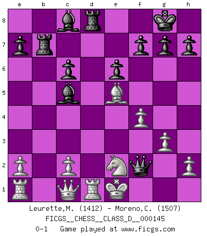 Last move : 0-1 2010 May 28 22:17:39 [Event "FICGS__CHESS__CLASS_D__000145"] [Site "FICGS"] [Date "2010.04.03"] [Round "1"] [White "Leurette,Marc-Antoine"] [Black "Moreno,Ciro"] [Result "0-1"] [WhiteElo "1412"] [BlackElo "1507"] 1.e4 c5 2.Nc3 Nc6 3.g3 e6 4.Bg2 Nf6 5.d3 d5 6.f4 d4 7.e5 dxc3 8.exf6 Qxf6 9.Bxc6+ bxc6 10.bxc3 Qxc3+ 11.Bd2 Qa3 12.Bc1 Qa4 13.Ne2 Rb8 14.O-O Be7 15.Bd2 c4 16.Bc3 O-O 17.Be5 Rb7 18.dxc4 Rd8 19.Qc1 Qxc4 20.Re1 Bc5+ 21.Kf1 Qd5 22.Rd1 Qf3+ 23.Ke1 Qf2+ 0-1 Sicilian : Closed Kingside Castling by player White (move 14) Kingside Castling by player Black (move 16) Player Black won this chess game. Follow this game move after move (download)Man is a frivolous, a specious creature, and like a Chess player, cares more for the process of attaining his goal than for the goal itself. (Dostoyevsky) Es ist schade, dass viele Schachsportler vergessen, wie wichtig Auftreten und angemessene Kleidung sind. (Alexandra Kosteniuk) Los errores estan ahí, esperando a que se cometan. (Savielly Tartakower) Le joueur d'Echecs qui veut atteindre le top est obligé de développer son propre credo créatif. Alexeï Stepanovicth Souétine. Il est facile d'écrire des livres ! Ce qui est difficile, c'est de jouer ! (Alexeï Stepanovicth Souétine) Experiences are the keys to life. (Daniel Parmet)