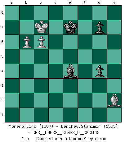 Last move : 1-0 2010 September 16 9:27:15 [Event "FICGS__CHESS__CLASS_D__000145"] [Site "FICGS"] [Date "2010.04.03"] [Round "1"] [White "Moreno,Ciro"] [Black "Denchev,Stanimir"] [Result "1-0"] [WhiteElo "1507"] [BlackElo "1595"] 1.c4 e5 2.Nc3 Nf6 3.Nf3 Nc6 4.d4 exd4 5.Nxd4 Bc5 6.Nxc6 bxc6 7.a3 a5 8.Bg5 Bxf2+ 9.Kd2 Bc5 10.e4 d6 11.Qa4 Rb8 12.Kc2 O-O 13.Bd3 Rb6 14.Rhf1 Bd4 15.Rab1 h6 16.Ne2 Be5 17.Be3 c5 18.Qxa5 Bb7 19.Ng3 Bxg3 20.hxg3 Nxe4 21.Qe1 d5 22.Bxe4 dxe4 23.Rd1 Qe7 24.Rf5 Qe6 25.Rxc5 Rc6 26.Rxc6 Bxc6 27.Rd4 Rb8 28.Qa5 Qe7 29.g4 Ra8 30.Qf5 Rd8 31.Qc5 Qe8 32.g5 Rxd4 33.Bxd4 h5 34.b4 e3 35.Bxe3 Qe4+ 36.Kc3 Qxg2 37.b5 Be4 38.Qd4 h4 39.Kb4 h3 40.Bf4 Bb7 41.a4 h2 42.g6 fxg6 43.Qd8+ Kh7 44.Qh4+ Kg8 45.Qxh2 Qxh2 46.Bxh2 Kf7 47.c5 c6 48.Ka5 cxb5 49.axb5 Ke7 50.Kb6 Be4 51.Kc7 g5 52.b6 g4 53.c6 1-0 English Opening Kingside Castling by player Black (move 12) 10 pieces endgame at move 46 : White KBPPP , Black KBPPP WHITE : King + 1 Bishop 3 Pawns BLACK : King + 1 Bishop 3 Pawns 9 pieces endgame at move 48 : White KBPP , Black KBPPP WHITE : King + 1 Bishop 2 Pawns BLACK : King + 1 Bishop 3 Pawns 8 pieces endgame at move 49 : White KBPP , Black KBPP WHITE : King + 1 Bishop 2 Pawns BLACK : King + 1 Bishop 2 Pawns Player White won this chess game. Follow this game move after move (download)Blessed be the memory of him who gave the world this immortal game. (A. G. Gardiner) Die FIDE ist dabei in die Hände der russischen Mafia zu fallen. (Larry Evans) Te sientas frente a un tablero y repentinamente tu corazón brinca. Tu mano tiembla al tomar una pieza y moverla. Pero lo que el Ajedrez te enseña es que tu debes permanecer ahí con calma y pensar de que si realmente es una buena idea o de que si hay otras ideas mejores. (Stanley Kubrick) Nous vivons dans un monde échiquéen : chaque jour qui passe est un défi à relever. (Philosophe Sasha) The only thing that matters is the evidence. (Horatio Caine, C.S.I. Miami)