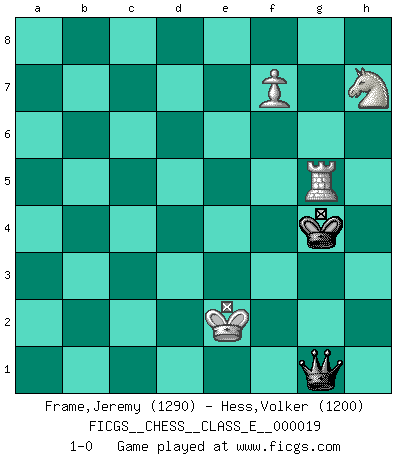 Last move : 1-0 2006 November 13 18:32:48 [Event "FICGS__CHESS__CLASS_E__000019"] [Site "FICGS"] [Date "2006.10.25"] [Round "1"] [White "Frame,Jeremy"] [Black "Hess,Volker"] [Result "1-0"] [WhiteElo "1290"] [BlackElo "1200"] 1.e4 c5 2.c3 d6 3.d4 cxd4 4.cxd4 Nf6 5.Nc3 e6 6.Nf3 Be7 7.h3 O-O 8.Bd3 Nc6 9.Be3 e5 10.dxe5 Nxe5 11.O-O Bxh3 12.gxh3 Nxd3 13.Qxd3 Qd7 14.Rad1 Qxh3 15.Bf4 Rac8 16.Bxd6 Bxd6 17.Qxd6 Qxf3 18.Qg3 Qxg3+ 19.fxg3 Ng4 20.Rd7 Rfd8 21.Rxb7 Rd2 22.Rd1 Rc2 23.R1d7 Ne5 24.Re7 Nf3+ 25.Kf1 Rf8 26.a4 h5 27.a5 h4 28.gxh4 Nxh4 29.a6 g5 30.Ne2 g4 31.b4 Ra2 32.e5 Rxa6 33.Nd4 g3 34.Rxa7 Rb6 35.e6 Rxb4 36.exf7+ Kg7 37.Ne6+ Kf6 38.Nxf8 g2+ 39.Ke2 g1Q 40.Nh7+ Kg6 41.Ra6+ Kh5 42.Re5+ Nf5 43.Rxf5+ Kh4 44.Rh6+ Kg3 45.Rg6+ Rg4 46.Rxg4+ Kxg4 47.Rg5+ 1-0 Sicilian : Alapin's variation (2.c3) Kingside Castling by player Black (move 7) Kingside Castling by player White (move 11) 10 pieces endgame at move 36 : White KRRNP , Black KRRNP WHITE : King + 2 Rooks 1 Knight 1 Pawn BLACK : King + 2 Rooks 1 Knight 1 Pawn 9 pieces endgame at move 38 : White KRRNP , Black KRNP WHITE : King + 2 Rooks 1 Knight 1 Pawn BLACK : King + 1 Rook 1 Knight 1 Pawn Promotion Queen by player Black (move 39) 8 pieces endgame at move 43 : White KRRNP , Black KQR WHITE : King + 2 Rooks 1 Knight 1 Pawn BLACK : King + 1 Queen 1 Rook 7 pieces endgame at move 46 : White KRRNP , Black KQ WHITE : King + 2 Rooks 1 Knight 1 Pawn BLACK : King + 1 Queen 6 pieces endgame at move 46 : White KRNP , Black KQ WHITE : King + 1 Rook 1 Knight 1 Pawn BLACK : King + 1 Queen Player White won this chess game. Follow this game move after move (download)Chess is really ninety nine percent calculation. (Soltis) Im Schach gibt es keinen Platz für Galanterie. (Irving Chernev) Durante una competencia de Ajedrez, un Maestro de Ajedrez deberá ser una combinación de presa de caza y un Monge. (Alexander Alekhine) Le moment que je préfère le plus dans une rencontre, c'est celui où je sens que la personnalité de l'adversaire se brise. (Robert Fischer) In fact if nothing is done against this teddy bear, hereby I announce that I would quit chess, rapid chess, blitz chess, postal chess, email chess, server chess and correspondence chess I will then switch to a table game where teddy bears aren't going to be seen for a while, like Poker, or Roulette, all 18+ games. (Elmer Valderrama)