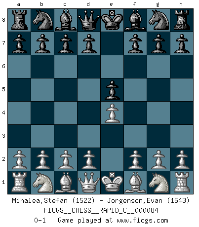 Last move : 0-1 2010 May 8 7:51:39 [Event "FICGS__CHESS__RAPID_C__000084"] [Site "FICGS"] [Date "2010.04.03"] [Round "1"] [White "Mihalea,Stefan"] [Black "Jorgenson,Evan"] [Result "0-1"] [WhiteElo "1522"] [BlackElo "1543"] 1.e4 e5 0-1 This chess game has been lost on time (started : 2010.04.03 11:43:41) King's pawn game Player Black won this chess game. Follow this game move after move (download)As one by one I mowed them down, my superiority soon became apparent. (Jose Capablanca) Bis jetzt ist Weiß einer wohlbekannten Analyse gefolgt. Aber jetzt begeht er einen schrecklichen Fehler: Er beginnt seinen eigenen Kopf zu benutzen. (Siegbert Tarrasch) Hay jugadores fuertes y personas amables y yo soy un jugador fuerte. (Bobby Fischer) Votre prénom est 'Tactique', votre deuxième prénom est 'Tactique' et votre nom est 'Tactique'. (Ken Smith) I find your interest interesting. (Gregory House, House M.D.)