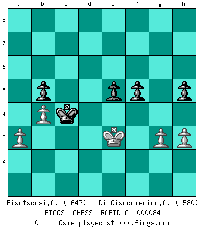 Last move : 0-1 2010 June 3 21:21:7 [Event "FICGS__CHESS__RAPID_C__000084"] [Site "FICGS"] [Date "2010.04.03"] [Round "1"] [White "Piantadosi,Angelo"] [Black "Di Giandomenico,Alfonso"] [Result "0-1"] [WhiteElo "1647"] [BlackElo "1580"] 1.e4 c5 2.Nc3 e6 3.d3 d6 4.g3 Nf6 5.Bg2 Nc6 6.f4 Be7 7.Nf3 O-O 8.O-O a6 9.Be3 Qc7 10.d4 cxd4 11.Nxd4 Nxd4 12.Bxd4 Bd7 13.e5 dxe5 14.Bxe5 Qb6+ 15.Kh1 Bc6 16.Bxc6 Qxc6+ 17.Qf3 Qb6 18.b3 Rfd8 19.Rad1 Ne8 20.Na4 Qa5 21.Qxb7 Bf6 22.Rd7 Rxd7 23.Qxa8 Rd8 24.Qe4 Bxe5 25.fxe5 Qd5 26.Re1 Qxe4+ 27.Rxe4 Rd1+ 28.Kg2 Rd2+ 29.Kf3 Rxc2 30.Re2 Rc6 31.Ke3 Nc7 32.Kd3 Kf8 33.Rc2 Rxc2 34.Kxc2 Ke7 35.Nc3 f6 36.exf6+ gxf6 37.Kd3 Kd6 38.Kd4 f5 39.a3 h6 40.b4 Nb5+ 41.Nxb5+ axb5 42.h3 e5+ 43.Ke3 h5 44.Kf3 Kd5 45.Ke3 Kc4 0-1 Sicilian : Closed Kingside Castling by player Black (move 7) Kingside Castling by player White (move 8) 10 pieces endgame at move 41 : White KPPPP , Black KPPPP WHITE : King + 4 Pawns BLACK : King + 4 Pawns Player Black won this chess game. Follow this game move after move (download)Chess is so inspiring that I do not believe a good player is capable of having an evil thought during the game. (Wilhelm Steinitz) Ein Teil des Fehlers ist immer korrekt. (Savielly Grigorievitsch Tartakower) Dejen al perfeccionista jugar por correo. (Yasser Seirawan) La victoire dans une partie d'Echecs appartient la plupart du temps à celui qui voit un peu plus loin que l'adversaire. (Lasker) The only thing that overcomes hard luck is hard work. (Harry Golden)