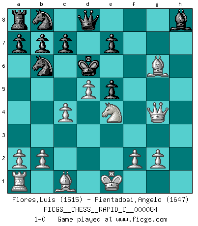 Last move : 1-0 2010 April 23 1:44:37 [Event "FICGS__CHESS__RAPID_C__000084"] [Site "FICGS"] [Date "2010.04.03"] [Round "1"] [White "Flores,Luis"] [Black "Piantadosi,Angelo"] [Result "1-0"] [WhiteElo "1515"] [BlackElo "1647"] 1.e4 Nf6 2.e5 Nd5 3.d4 d6 4.Nf3 Nc6 5.c4 Nb6 6.e6 fxe6 7.Nc3 g6 8.h4 Bg7 9.h5 e5 10.d5 Nb8 11.hxg6 hxg6 12.Rxh8+ Bxh8 13.Bd3 Bg4 14.Bxg6+ Kd7 15.Nxe5+ dxe5 16.Qxg4+ Kd6 17.Ne4+ 1-0 Alekhine's defense : Modern variation Player White won this chess game. Follow this game move after move (download)Chess is 99 percent tactics. (Teichmann) Ich verlor meine Bürgerrechte, mein Gehalt wurde mir nicht mehr bezahlt und ich wurde zensiert und durfte nicht mehr ins Ausland reisen. [nach dem Match Fischer-Taimanov 6:0] (Mark Taimanov) Yo considero que Fischer es uno de los expertos mas grandes de aperturas de siempre. (Keith Hayward) La vie est comme un jeu d'échecs : nous esquissons un plan, mais celui-ci est tributaire de ce que daignent faire l'adversaire aux échecs et le destin dans la vie. (Arthur Schopenhauer) Ah, beer! The cause of, and the solution to, all of life's problems. (Homer Simpson)