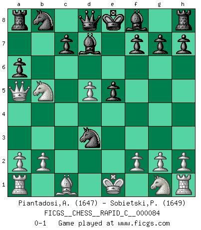 Last move : 0-1 2010 April 18 0:22:21 [Event "FICGS__CHESS__RAPID_C__000084"] [Site "FICGS"] [Date "2010.04.03"] [Round "1"] [White "Piantadosi,Angelo"] [Black "Sobietski,Piotr"] [Result "0-1"] [WhiteElo "1647"] [BlackElo "1649"] 1.d4 d5 2.c4 dxc4 3.e4 e5 4.d5 Nf6 5.Nc3 b5 6.Nxb5 Nxe4 7.Bxc4 a6 8.Qa4 Bd7 9.Bd3 Nc5 10.Qa5 Nxd3+ 0-1 QGA : 3.e4 Player Black won this chess game. Follow this game move after move (download)When you are lonely, when you feel yourself an alien in the world, play Chess. This will raise your spirits and be your counselor in war. (Aristotle) Wie bekannt hörte Morphy 1859 auf, Schach zu spielen. Seine Enttäuschung galt nicht so sehr dem Schach, wie den Schachspielern. (Robert James Fischer) Bobby solo arroja las piezas y solas caen en las casillas correctas. (Miguel Najdorf ) Mais n'est-ce pas déjà le limiter injurieusement que d'appeler les échecs un jeu? N'est-ce pas aussi une science, un art, ou quelque chose qui, comme le cercueil de Mahomet entre ciel et terre, est suspendu entre l'un et l'autre, et qui réunit un nombre incroyable de contraires ? (Stefan Zweig) Hello Thibault, if I have had a plan (and I had one, I hope), I have forgotten it during the last week... - Hello Heinz-Georg. What do you mean a plan ? (Anonymous players, during a Big Chess game)