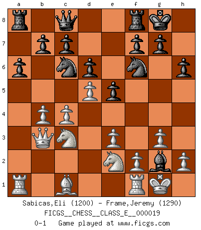 Last move : 0-1 2007 January 18 12:37:27 [Event "FICGS__CHESS__CLASS_E__000019"] [Site "FICGS"] [Date "2006.10.25"] [Round "1"] [White "Sabicas,Eli"] [Black "Frame,Jeremy"] [Result "0-1"] [WhiteElo "1200"] [BlackElo "1290"] 1.c4 e5 2.Nc3 Nc6 3.g3 Nf6 4.Bg2 Bc5 5.e3 O-O 6.Nge2 d6 7.O-O Bd7 8.a3 h6 9.b4 Bxb4 10.axb4 a6 11.Qb3 Qc8 12.d4 Bh3 13.d5 Bxg2 0-1 This chess game has been lost on time (started : 2006.10.25 2:8:4) English : Sicilian Reversed Kingside Castling by player Black (move 5) Kingside Castling by player White (move 7) Player Black won this chess game. Follow this game move after move (download)In a gambit you give up a Pawn for the sake of getting a lost game. (Samuel Standige Boden) Es ist wirklich schade, dass so viele Schachspieler nicht auf ihr Äußeres achten! (Alexandra Kosteniuk) Si un gobernante no entiende al Ajedrez, ¿como puede governar él un reinado?. (El Rey Khusros II) Les échecs c'est le défi de l'alpiniste, toujours plus haut, prêt à tout pour monter à l'assaut du Roi ennemi. Les échecs, c'est de la musique en mouvement, un ballet majestueux pour les yeux. C'est de la poésie composée par les fantômes du passé qui au même titre que Rimbaud ou Verlaine méritent notre admiration. Les échecs, c'est de la peinture ou le moindre mouvement modifie le tableau pour en faire un Picasso ou un Van Gogh. Les échecs, c'est tout et rien, c'est la vie et la mort. Jjulie33 sur le forum de France-Echecs. The problem with troubleshooting is that trouble shoots back. (Anonymous)