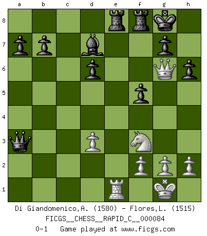 Last move : 0-1 2010 May 4 13:35:20 [Event "FICGS__CHESS__RAPID_C__000084"] [Site "FICGS"] [Date "2010.04.03"] [Round "1"] [White "Di Giandomenico,Alfonso"] [Black "Flores,Luis"] [Result "0-1"] [WhiteElo "1580"] [BlackElo "1515"] 1.e4 c5 2.Nf3 Nc6 3.d4 cxd4 4.Nxd4 e5 5.Nf3 Nf6 6.Nc3 Bb4 7.Bd2 Bxc3 8.Bxc3 Nxe4 9.Bxe5 Qa5+ 10.Bc3 Nxc3 11.bxc3 Qxc3+ 12.Nd2 Nb4 13.Rc1 Nxa2 14.Bd3 Nxc1 15.O-O Nxd3 16.cxd3 O-O 17.Ne4 Qa3 18.Qh5 f5 19.Ng5 h6 20.Nf3 d6 21.Qg6 Bd7 22.Re1 Rae8 0-1 Sicilian : Labourdonnais-Loewenthal variation Kingside Castling by player White (move 15) Kingside Castling by player Black (move 16) Player Black won this chess game. Follow this game move after move (download)Not only will I predict his triumph over Botvinnik, but I'll go further and say that he'll probably be the greatest Chess player that ever lived. (John Collins) Es genügt nicht ein guter Spieler zu sein, man muß auch gut spielen. (Siegbert Tarrasch) Un buen sacrificio es aquel que aunque no sea necesariamente sólido, deja a tu oponente aturdido y confuso. (Rudolph Spielmann) Même si vous avez un bon coup à faire, regardez toujours s'il n'y en a pas un qui lui soit préférable. (Pedro Damiano) A clear conscience is usually the sign of a bad memory. (Unknown)