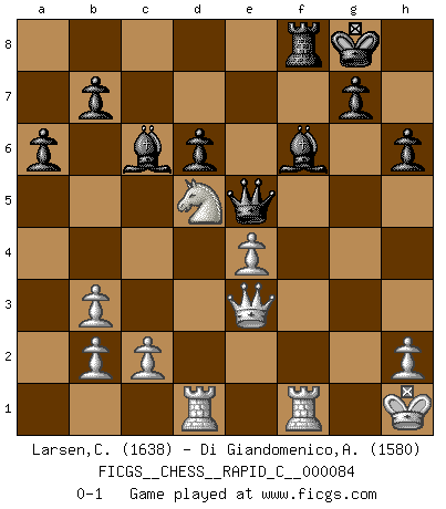 Last move : 0-1 2010 June 15 8:46:12 [Event "FICGS__CHESS__RAPID_C__000084"] [Site "FICGS"] [Date "2010.04.03"] [Round "1"] [White "Larsen,Caleb"] [Black "Di Giandomenico,Alfonso"] [Result "0-1"] [WhiteElo "1638"] [BlackElo "1580"] 1.e4 c5 2.Nf3 e6 3.d4 cxd4 4.Nxd4 d6 5.Nc3 Nf6 6.Bc4 a6 7.Bb3 Be7 8.O-O Bd7 9.f4 Nc6 10.Be3 O-O 11.g4 h6 12.f5 Na5 13.fxe6 Nxb3 14.axb3 fxe6 15.Nf3 Nxg4 16.Qd2 Nxe3 17.Qxe3 Rc8 18.Kh1 Bc6 19.Rad1 Qc7 20.Nd4 Bf6 21.Nxe6 Qe7 22.Nxf8 Rxf8 23.Nd5 Qe5 0-1 This chess game has been lost on time (started : 2010.04.03 11:43:41) Sicilian defense Kingside Castling by player White (move 8) Kingside Castling by player Black (move 10) Player Black won this chess game. Follow this game move after move (download)Help your pieces so they can help you. (Paul Morphy) Fischer ist das größte Genie, das je vom Schachhimmel heruntergestiegen ist. (Mikhail Nekhemyevich Tal) El Ajedrez expande y enriquece tu mente. (Saudin Robovic) Demandez au pauvre Cg1 ce qu'il en pense. Eduard Gufeld à propos de la variante Saemisch de l'Est-Indienne. Life is like a game of cards: the hand you are dealt represents determinism; the way you play it is free will. (Jawaharlal Nehru)