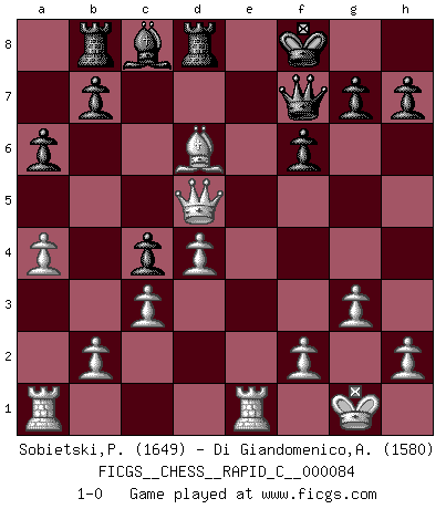 Last move : 1-0 2010 May 6 13:30:59 [Event "FICGS__CHESS__RAPID_C__000084"] [Site "FICGS"] [Date "2010.04.03"] [Round "1"] [White "Sobietski,Piotr"] [Black "Di Giandomenico,Alfonso"] [Result "1-0"] [WhiteElo "1649"] [BlackElo "1580"] 1.e4 c5 2.Nf3 e6 3.d3 d6 4.g3 Nf6 5.Bg2 Nc6 6.O-O Be7 7.a4 a6 8.Nbd2 O-O 9.c3 Qc7 10.Re1 Rb8 11.e5 dxe5 12.Nc4 Rd8 13.Nfxe5 Nxe5 14.Bf4 Bd6 15.Nxe5 Nd5 16.Bxd5 exd5 17.d4 c4 18.Qf3 f6 19.Qxd5+ Kf8 20.Nf7 Qxf7 21.Bxd6+ 1-0 Sicilian defense Kingside Castling by player White (move 6) Kingside Castling by player Black (move 8) Player White won this chess game. Follow this game move after move (download)A chess genius has died; a loss for humanity. (Viktor Kortchnoi, about Bobby Fischer's death) Aljechin war kein Nazi. Er war ein Opportunist. Ein schrecklicher Mann. Er liebte Geld über alles und würde für Geld ein Jude, ein Katolik oder ein Protestant werden. (Miguel Najdorf) No hay un Gran Maestro de Ajedrez que sea normal; solo se diferencían ellos por la magnitud de su locura. (Viktor Korchnoi) La guerre est enfant de la passion, la passion est enfant du narcissisme et le narcissisme est l'enfant. (...) Une autre partie ? (Thibault de Vassal) A good player is always lucky. (Capablanca)