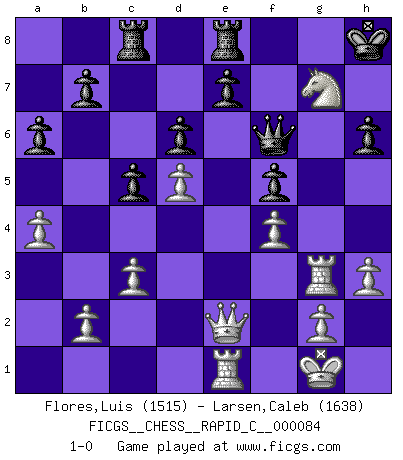 Last move : 1-0 2010 June 11 9:29:35 [Event "FICGS__CHESS__RAPID_C__000084"] [Site "FICGS"] [Date "2010.04.03"] [Round "1"] [White "Flores,Luis"] [Black "Larsen,Caleb"] [Result "1-0"] [WhiteElo "1515"] [BlackElo "1638"] 1.d4 Nf6 2.Bg5 c5 3.d5 Qb6 4.Bxf6 Qxf6 5.Nc3 a6 6.Nf3 d6 7.e3 Bg4 8.Be2 g6 9.Nd2 Bxe2 10.Qxe2 Bg7 11.O-O O-O 12.a4 Nd7 13.Nde4 Qh4 14.f4 Nf6 15.h3 Nxe4 16.Nxe4 f5 17.Ng5 h6 18.Ne6 Rfc8 19.e4 Rab8 20.exf5 gxf5 21.c3 Qf6 22.Rae1 Re8 23.Rf3 Rbc8 24.Rg3 Kh8 25.Nxg7 1-0 This chess game has been lost on time (started : 2010.04.03 11:43:41) Trompowsky attack (Ruth, Opovcensky Opening) Kingside Castling by player White (move 11) Kingside Castling by player Black (move 11) Player White won this chess game. Follow this game move after move (download)I'm not afraid of Spassky. The world knows I'm the best. You don't need a match to prove it. (Bobby Fischer) Zeige mir drei Eröffnungsvarianten und ich beweise dir, dass zwei davon inkorrekt sind. (Emanuel Lasker) Puntos débiles o agujeros en la posición de tu oponente deben de ser ocupados por piezas, no Peones. (Siegbert Tarrasch) La vie et les Echecs sont tous les deux une lutte constante. (Lasker) The Internet isn't free. It just has an economy that makes no sense to capitalism. (Brad Shapcott)
