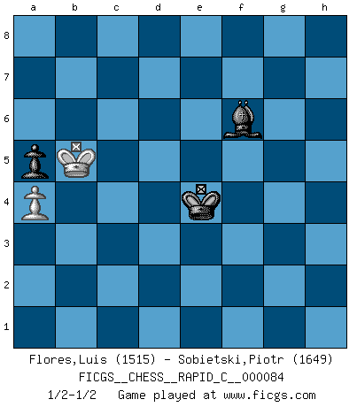 Last move : 1/2-1/2 2010 June 28 17:57:11 [Event "FICGS__CHESS__RAPID_C__000084"] [Site "FICGS"] [Date "2010.04.03"] [Round "1"] [White "Flores,Luis"] [Black "Sobietski,Piotr"] [Result "1/2-1/2"] [WhiteElo "1515"] [BlackElo "1649"] 1.d4 d5 2.c4 dxc4 3.Nf3 Nf6 4.e3 e6 5.Bxc4 c5 6.O-O a6 7.a4 Nc6 8.Qe2 Qc7 9.Rd1 Bd6 10.dxc5 Bxc5 11.b3 O-O 12.Bb2 e5 13.h3 Qe7 14.Nbd2 e4 15.Ng5 Bf5 16.Nf1 Bg6 17.Ng3 Rad8 18.Bxf6 gxf6 19.Nxf7 Rxf7 20.h4 Rxd1+ 21.Rxd1 h5 22.Nxh5 Ne5 23.Nf4 Kg7 24.Nxg6 Kxg6 25.Bxf7+ Qxf7 26.Qc2 Nd3 27.Kf1 Qh7 28.Rxd3 exd3 29.Qxd3+ f5 30.g4 Qf7 31.Kg2 Qe6 32.h5+ Kh6 33.gxf5 Qg8+ 34.Kf1 a5 35.Qc3 b6 36.e4 Qd8 37.Qf3 Qf6 38.Qg3 Qg5 39.Qf3 Bd6 40.Qc3 Kxh5 41.Qh8+ Qh6 42.Qc3 Qf4 43.Qh8+ Kg4 44.Qg7+ Qg5 45.Qc3 Qh4 46.Ke2 Kg5 47.f3 Qh2+ 48.Kd3 Qg3 49.Qg7+ Kf4 50.Qxg3+ Kxg3 51.Kc4 Kxf3 52.e5 Bxe5 53.b4 Ke4 54.bxa5 bxa5 55.Kb5 Bc3 56.f6 Bxf6 1/2-1/2 QGA : Classical, Rubinstein variation Kingside Castling by player White (move 6) Kingside Castling by player Black (move 11) 10 pieces endgame at move 50 : White KPPPPP , Black KBPP WHITE : King + 5 Pawns BLACK : King + 1 Bishop 2 Pawns 9 pieces endgame at move 51 : White KPPPP , Black KBPP WHITE : King + 4 Pawns BLACK : King + 1 Bishop 2 Pawns 8 pieces endgame at move 52 : White KPPP , Black KBPP WHITE : King + 3 Pawns BLACK : King + 1 Bishop 2 Pawns 7 pieces endgame at move 54 : White KPPP , Black KBP WHITE : King + 3 Pawns BLACK : King + 1 Bishop 1 Pawn 6 pieces endgame at move 54 : White KPP , Black KBP WHITE : King + 2 Pawns BLACK : King + 1 Bishop 1 Pawn 5 pieces endgame at move 56 : White KP , Black KBP WHITE : King + 1 Pawn BLACK : King + 1 Bishop 1 Pawn This chess game ended in a draw. Follow this game move after move (download)Chess is no whit inferior to the violin, and we have a large number of professional violinists. (Mikhail Botvinnik) Gewöhnliche Menschen denken nur daran, wie sie ihre Zeit verbringen. Ein intelligenter Mensch versucht, sie auszunutzen. (Arthur Schopenhauer) Un sacrificio se refuta mucho mejor al aceptarlo. (Wilhelm Steinitz) Celui qui prend des risques peut perdre, celui qui n'en prend pas perd toujours. (Xavier Tartacover) Perfection is achieved, not when there is nothing more to add, but when there is nothing left to take away. (Antoine de Saint-Exupéry)