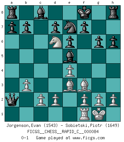 Last move : 0-1 2010 April 30 8:6:18 [Event "FICGS__CHESS__RAPID_C__000084"] [Site "FICGS"] [Date "2010.04.03"] [Round "1"] [White "Jorgenson,Evan"] [Black "Sobietski,Piotr"] [Result "0-1"] [WhiteElo "1543"] [BlackElo "1649"] 1.e4 c5 2.Nc3 Nc6 3.Nf3 e6 4.Bd3 g6 5.O-O Bg7 6.b3 Nge7 7.Nb5 Bxa1 8.Nd6+ Kf8 9.Ba3 Bf6 10.Bxc5 Qa5 11.Be3 Qxa2 12.Qa1 Bxa1 13.Ng5 Ne5 14.Be2 h6 15.Nf3 Nxf3+ 16.Bxf3 Be5 0-1 Sicilian : Closed, 2...Nc6 Kingside Castling by player White (move 5) Player Black won this chess game. Follow this game move after move (download)Who is your opponent tonight, tonight I am playing against the Black pieces. (Akiba Rubinstein) Schon mancher Spieler hat aufgegeben, um zu vermeiden, daß er eine Figur verliert. (Savielly Grigorievitsch Tartakower) El Ajedrez se juega con la mente... ¡no con las manos!. (Renaud y Kahn) Vouloir jouer aux échecs contre soi-même est aussi paradoxal que vouloir marcher sur son ombre. (Stefan Zweig) The only difference between a tax man and a taxidermist is that the taxidermist leaves the skin. (Mark Twain)