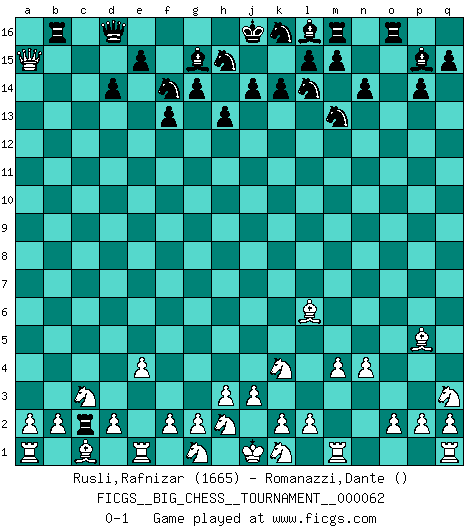 Last move : 0-1 2010 July 6 17:6:48 [Event "FICGS__BIG_CHESS__TOURNAMENT__000062"] [Site "FICGS"] [Date "2010.04.03"] [Round "1"] [White "Rusli,Rafnizar"] [Black "Romanazzi,Dante"] [Result "0-1"] [WhiteElo "1665"] [BlackElo ""] 1.j2-k4 p15-p14 2.h1-o7 g15-g14 3.o7-o15 p16-o14 4.e2-e4 j15-l14 5.o15-f7 f15-f13 6.f7-c7 k15-k14 7.c7-c15 f16-g15 8.n2-n4 d15-d14 9.c15-c3 o16-p15 10.m2-m4 q16-p16 11.f1-c4 p16-o16 12.c4-h9 n15-n14 13.o1-f9 b16-c14 14.c3-b4 h14-h13 15.f9-g10 c16-d15 16.b4-b15 a16-d16 17.g10-c14 d15-c14 18.h9-c14 d16-b16 19.b15-a15 e16-c16 20.p1-q3 g16-f14 21.c14-l6 h16-d16 22.l1-p5 c16-c2 23.b1-c3 o14-m13 0-1 Follow this game move after move (download)A big shock; the best chess player in history has passed away. (Lajos Portisch, about Bobby Fischer's death) Ja, ich habe einmal eine Blitzpartie gespielt, es war in einem Zug, 1929. --im Interview 1989 (Mikhail Moiseyevich Botvinik) Dejen al perfeccionista jugar por correo. (Yasser Seirawan) Les échecs, c'est l'imagination. (David Bronstein) Home computers are being called upon to perform many new functions, including the consumption of homework formerly eaten by the dog. (Doug Larson)