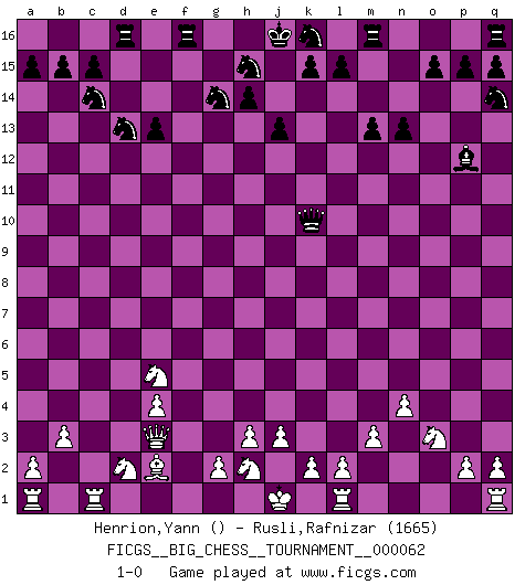 Last move : 1-0 2010 July 13 9:27:0 [Event "FICGS__BIG_CHESS__TOURNAMENT__000062"] [Site "FICGS"] [Date "2010.04.03"] [Round "1"] [White "Henrion,Yann"] [Black "Rusli,Rafnizar"] [Result "1-0"] [WhiteElo ""] [BlackElo "1665"] 1.j2-k4 g15-g14 2.n2-n3 m15-m13 3.d2-d4 j15-k13 4.e2-e4 h16-o10 5.o2-o4 o10-f2 6.e1-e2 f2-d4 7.c2-c3 d4-b6 8.b1-d2 d15-d13 9.g1-f3 l16-p12 10.k1-l3 e15-e13 11.e2-e1 f16-b12 12.d2-c4 b6-j13 13.l3-m5 c16-n6 14.o1-l4 n15-n13 15.o4-o5 n6-o5 16.m2-m3 o16-f8 17.l1-m2 o5-k9 18.f1-d3 k9-j8 19.n3-n4 j8-m5 20.l4-m5 f8-k4 21.m2-k4 b12-k4 22.m5-d13 b16-c14 23.d13-f15 e16-d16 24.d3-e2 g16-e15 25.b2-b3 k4-g7 26.c1-d2 j13-l11 27.m1-l1 g7-c3 28.d2-c3 l11-c3 29.p1-o3 k13-h12 30.h1-g1 j14-j13 31.e1-c1 c3-k10 32.g1-f2 e15-d13 33.f15-g14 h12-g14 34.c4-e5 d16-f16 35.f2-d4 a16-d16 36.d4-e3 p16-q14 37.f3-d2 1-0 This big chess game has been lost on time (started : 2010.04.03 12:50:54) Follow this game move after move (download)Robert Fischer is a law unto himself. (Larry Evans) Wenn Schach ein enormer Dschungel ist, der seine Myriaden von Geheimnissen nicht preisgeben will, dann sind Computer die Kettensägen einer gewaltigen ökologisch unsensiblen Nutzholzfirma. (Nigel Short) Una mala movida nulifica cuarenta buenas. (Horowitz) La victoire dans une partie d'Echecs appartient la plupart du temps à celui qui voit un peu plus loin que l'adversaire. (Lasker) The only thing that overcomes hard luck is hard work. (Harry Golden)