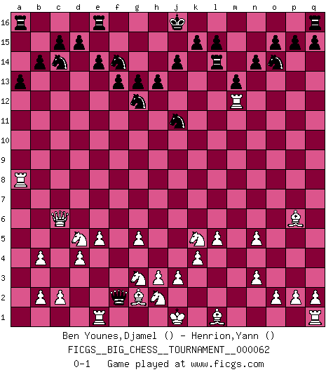 Last move : 0-1 2010 July 8 9:18:56 [Event "FICGS__BIG_CHESS__TOURNAMENT__000062"] [Site "FICGS"] [Date "2010.04.03"] [Round "1"] [White "Ben Younes,Djamel"] [Black "Henrion,Yann"] [Result "0-1"] [WhiteElo ""] [BlackElo ""] 1.g2-g4 g16-f14 2.l2-l4 k16-l14 3.k1-l3 e15-e14 4.e2-e4 n15-n14 5.d2-d4 b16-c14 6.m2-m4 f16-b12 7.k2-k4 g15-g13 8.e4-e5 m15-m13 9.l3-k5 l16-m15 10.j2-h4 b15-b14 11.b1-c3 o16-b4 12.c1-d2 c16-a14 13.g1-e2 l14-m12 14.a2-a3 b4-e7 15.g4-g5 j15-k13 16.e2-g3 f14-g12 17.c3-d5 e7-g9 18.h1-f3 f15-f13 19.f1-g2 a14-k5 20.h4-k5 k13-j11 21.n2-n3 m15-c6 22.f3-f6 h16-d12 23.f6-c6 p16-o14 24.d2-b4 g9-b4 25.a3-b4 h15-f14 26.o1-m3 a15-a13 27.p1-o3 m16-m14 28.m3-p6 h14-h13 29.a1-a8 m14-l14 30.o3-n5 b12-d14 31.l4-l5 d14-n5 32.m4-n5 d12-f12 33.m1-m12 f12-f2 0-1 This big chess game has been lost on time (started : 2010.04.03 12:50:54) Follow this game move after move (download)It is the aim of the modern school, not to treat every position according to one general law, but according to the principle inherent in the position. (Richard Reti) Ich rechne überhaupt nicht voraus. Ich gewinne auch so. (Robert James Fischer) Ciertamente, de todas la drogas del mundo, el Ajedrez debe ser el mas placentero permamentemente. (Assiac) Un footballeur joue avec ses pieds, parfois avec sa tête. Un joueur d'échecs ne joue qu'avec sa tête. Et quand il ne joue plus, il meurt. (Jacob Murray) Do you know these so called Volunteers don't even get paid! (Simpsons)