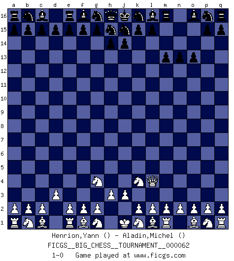Last move : 1-0 2010 May 11 19:51:15 [Event "FICGS__BIG_CHESS__TOURNAMENT__000062"] [Site "FICGS"] [Date "2010.04.03"] [Round "1"] [White "Henrion,Yann"] [Black "Aladin,Michel"] [Result "1-0"] [WhiteElo ""] [BlackElo ""] 1.h2-g4 m15-m13 2.j2-k4 n15-n13 3.d2-d3 o15-o13 4.h1-l4 1-0 This big chess game has been lost on time (started : 2010.04.03 12:50:54) Follow this game move after move (download)There are two types of sacrifices: correct ones and mine. (Mikhail Tal) Wie bekannt hörte Morphy 1859 auf, Schach zu spielen. Seine Enttäuschung galt nicht so sehr dem Schach, wie den Schachspielern. (Robert James Fischer) ¿Porque tengo que perder ante este idiota?. (Aron Nimzovich) 'L'échange des dames est un coup dur pour les deux adversaires...' Un journaliste lors d'une partie du match Spassky-Fischer Whoever said the pen is mightier than the sword obviously never encountered automatic weapons. (US General Douglas MacArthur)