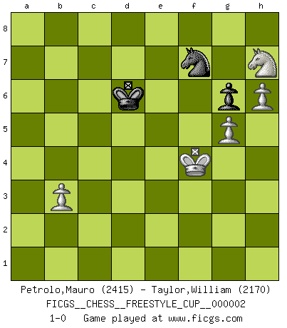 Last move : 1-0 2010 April 3 14:59:53 [Event "FICGS__CHESS__FREESTYLE_CUP__000002"] [Site "FICGS"] [Date "2010.04.03"] [Round "1"] [White "Petrolo,Mauro"] [Black "Taylor,William"] [Result "1-0"] [WhiteElo "2415"] [BlackElo "2170"] 1.e4 c5 2.Nf3 d6 3.d4 cxd4 4.Nxd4 Nf6 5.Nc3 a6 6.Be3 e5 7.Nb3 Be6 8.f3 Be7 9.Qd2 O-O 10.O-O-O Nbd7 11.g4 b5 12.g5 b4 13.Ne2 Ne8 14.f4 a5 15.f5 a4 16.fxe6 axb3 17.cxb3 fxe6 18.Bh3 Rxa2 19.Bxe6+ Kh8 20.Ng3 Nc7 21.Bc4 Qa8 22.Rhf1 Rxf1 23.Rxf1 Ra1+ 24.Kc2 Rxf1 25.Bxf1 d5 26.Qf2 Qc6+ 27.Kb1 d4 28.Bd2 g6 29.h4 Nc5 30.Bxb4 Nxe4 31.Qe1 Bxb4 32.Qxb4 Nc5 33.Qb8+ Kg7 34.Bc4 N5e6 35.Bxe6 Nxe6 36.Qxe5+ Kf7 37.Qe4 Qb5 38.Qf3+ Ke7 39.Qf6+ Kd7 40.Qf7+ Kd6 41.Ne4+ Ke5 42.Nd2 Qd5 43.Qf6+ Kd6 44.Nc4+ Kc6 45.Qh8 d3 46.Ka2 Qd8 47.Qxd8 Nxd8 48.Ne5+ Kb5 49.Nxd3 Ne6 50.Ka3 Nd4 51.Ne1 Ka5 52.b4+ Kb5 53.b3 Kc6 54.Kb2 Nf5 55.Nf3 Nd6 56.Kc3 Kd5 57.Kd3 Nb5 58.Ne1 Kc6 59.Nc2 Nd6 60.Kd4 Nf5+ 61.Ke4 Kd6 62.Ne3 Ng7 63.b5 Ne6 64.Nc4+ Kc5 65.Ke5 Ng7 66.Ne3 Kxb5 67.Ng4 Nf5 68.h5 Kc6 69.Nf6 Nd6 70.h6 Nf7+ 71.Kf4 Kd6 72.Nxh7 1-0 Sicilian : Najdorf, Byrne (English) attack Kingside Castling by player Black (move 9) Queenside Castling by player White (move 10) 10 pieces endgame at move 49 : White KNPPPP , Black KNPP WHITE : King + 1 Knight 4 Pawns BLACK : King + 1 Knight 2 Pawns 9 pieces endgame at move 66 : White KNPPP , Black KNPP WHITE : King + 1 Knight 3 Pawns BLACK : King + 1 Knight 2 Pawns 8 pieces endgame at move 72 : White KNPPP , Black KNP WHITE : King + 1 Knight 3 Pawns BLACK : King + 1 Knight 1 Pawn Player White won this chess game. Follow this game move after move (download)All I want to do, ever, is just play Chess. (Bobby Fischer) Je mehr ich von der FIDE weiss, um so weniger verstehe ich. (Alexander Kalifman) Para mi, el Ajedrez es la vida y cada partida es como una nueva vida. Todo jugador de Ajedrez suele vivir muchas vidas durante su vida. (Eduard Gufeld) À la honte des hommes, on sait que les lois du jeu sont les seules qui soient partout justes, claires, inviolables et exécutées. Pourquoi l'Indien qui a donné les règles du jeu d'échecs est-il obéi de bon gré dans toute la terre, et que les décrétales des papes, par exemple, sont aujourd'hui un objet d'horreur et de mépris ? C'est que l'inventeur des échecs combina tout avec justesse pour la satisfaction des joueurs, et que les papes, dans leurs décrétales, n'eurent en vue que leur seul avantage. L'Indien voulut exercer également l'esprit des hommes et leur donner du plaisir; les papes ont voulu abrutir l'esprit des hommes. Voltaire (Dictionnaire philosophique / Garnier 1967) Inventor: A person who makes an ingenious arrangement of wheels, levers and springs, and believes it civilization. (Ambrose Bierce, The Devil's Dictionary)