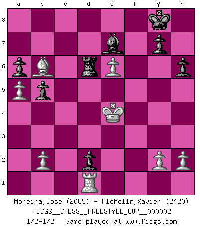 Last move : 1/2-1/2 2010 April 3 14:26:32 [Event "FICGS__CHESS__FREESTYLE_CUP__000002"] [Site "FICGS"] [Date "2010.04.03"] [Round "1"] [White "Moreira,Jose"] [Black "Pichelin,Xavier"] [Result "1/2-1/2"] [WhiteElo "2085"] [BlackElo "2420"] 1.e4 c5 2.Nf3 d6 3.d4 cxd4 4.Nxd4 Nf6 5.Nc3 a6 6.Bg5 e6 7.f4 Qb6 8.Nb3 Nbd7 9.Qf3 Qc7 10.a4 Be7 11.Be2 h6 12.Bh4 b6 13.O-O Bb7 14.Bg3 O-O 15.Qe3 Nc5 16.Nxc5 Qxc5 17.Qxc5 dxc5 18.Bf3 Rfd8 19.e5 Nd5 20.a5 b5 21.Rfd1 Rd7 22.Nxd5 Bxd5 23.Bxd5 exd5 24.c3 d4 25.cxd4 Rxd4 26.Rxd4 cxd4 27.Bf2 d3 28.Rd1 Rd8 29.Bb6 Rd5 30.Kf2 f6 31.Ke3 fxe5 32.Ke4 Rd7 33.fxe5 d2 34.e6 Rd6 35.Ke5 Rd3 36.Ke4 Rd6 37.Ke5 Rd3 38.Ke4 Rd6 1/2-1/2 Sicilian : Najdorf, 7...Qb6 Kingside Castling by player White (move 13) Kingside Castling by player Black (move 14) This chess game ended in a draw. Follow this game move after move (download)You sit at the board and suddenly your heart leaps. Your hand trembles to pick up the piece and move it. But what Chess teaches you is that you must sit there calmly and think about whether it's really a good idea and whether there are other better ideas. (Stanley Kubrick) Schach ist ein schwarz-weisser Dschungel. (Garry Kasparov) Del Ajedrez se ha dicho que la vida no es lo suficientemente larga para él, pero eso es culpa de la vida, no del Ajedrez. (William Ewart Napier) Ce n'est pas pour s'amuser qu'il joue aux échecs : il célèbre un culte. (Vladimir Nabokov) I couldn't make any sense out of what this particular thread is about. It sounds like R2 D2 computer speaking. A space fight ?!? Some 'command' problems in Moscow ? Some killers & narcotic addicts attacking some game & a god wannabe ?? (Dinesh De Silva, lost in a russian conflict in FICGS forum)