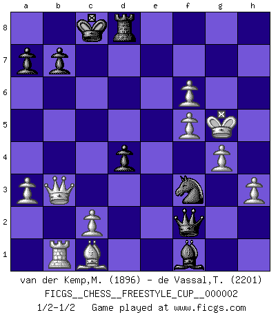 Last move : 1/2-1/2 2010 April 3 14:49:22 [Event "FICGS__CHESS__FREESTYLE_CUP__000002"] [Site "FICGS"] [Date "2010.04.03"] [Round "1"] [White "van der Kemp,Michel"] [Black "de Vassal,Thibault"] [Result "1/2-1/2"] [WhiteElo "1896"] [BlackElo "2201"] 1.e4 e6 2.d4 d5 3.Nc3 Bb4 4.e5 c5 5.a3 Bxc3+ 6.bxc3 Ne7 7.Qg4 Qc7 8.Qxg7 Rg8 9.Qxh7 cxd4 10.Ne2 Nbc6 11.f4 Bd7 12.Qd3 dxc3 13.Qxc3 Nf5 14.Rb1 O-O-O 15.Rg1 d4 16.Qd3 f6 17.g4 Nh4 18.exf6 e5 19.h3 Be6 20.Bg2 Nxg2+ 21.Rxg2 Rge8 22.Qg3 Bc4 23.f5 Qa5+ 24.Kf2 e4 25.Nf4 e3+ 26.Kg1 e2 27.Nxe2 Rxe2 28.Rxe2 Bxe2 29.Qb3 Qe1+ 30.Kg2 Bf1+ 31.Kf3 Ne5+ 32.Kf4 Qf2+ 33.Kg5 Nf3+ 34.Kg6 Ne5+ 35.Kg5 Nf3+ 1/2-1/2 French : Winawer, Advance, poisoned pawn variation Queenside Castling by player Black (move 14) This chess game ended in a draw. Follow this game move after move (download)Chess opens and enriches your mind. (Saudin Robovic) Ich kämpfe solange mein Gegner einen Fehler machen kann. (Emanuel Lasker) Solo existe una cosa que Fischer hace en el Ajedrez sin placer: ¡perder!. (Boris Spassky) Des combinaisons [dans le jeu d'échecs] pareilles à des mélodies. Je crois entendre pour ainsi dire la musique des coups... (Vladimir Nabokov) The arrogant army will lose certainly the battle. (Chinese proverb)