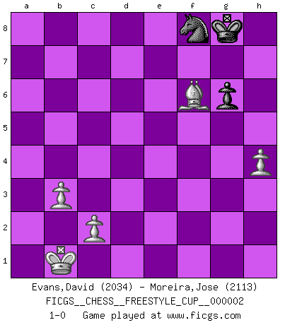 Last move : 1-0 2010 April 3 16:16:34 [Event "FICGS__CHESS__FREESTYLE_CUP__000002"] [Site "FICGS"] [Date "2010.04.03"] [Round "1"] [White "Evans,David"] [Black "Moreira,Jose"] [Result "1-0"] [WhiteElo "2034"] [BlackElo "2113"] 1.e4 c5 2.Nf3 d6 3.d4 cxd4 4.Nxd4 Nf6 5.Nc3 g6 6.Be3 Bg7 7.f3 O-O 8.Qd2 Nc6 9.Bc4 Bd7 10.O-O-O Rc8 11.Bb3 Na5 12.h4 Nxb3+ 13.axb3 h5 14.Kb1 Re8 15.Bg5 a6 16.Nde2 Bc6 17.Bh6 Bh8 18.g4 Qa5 19.gxh5 Nxh5 20.Rhg1 Bf6 21.f4 Qb4 22.f5 Bxe4 23.Nxe4 Qxe4 24.fxg6 fxg6 25.Nc3 Bxc3 26.bxc3 Rc5 27.Rdf1 Qe6 28.Qd3 Kh7 29.Bc1 Ng7 30.Rf4 Rd5 31.Qf3 Rg8 32.Rfg4 Nh5 33.c4 Rf5 34.Qxb7 Nf6 35.R4g3 Rf2 36.R3g2 Rxg2 37.Qxg2 Rg7 38.Bb2 Rg8 39.Qh1 Qf7 40.Re1 Re8 41.Qc6 Ng4 42.c5 dxc5 43.Qxc5 e5 44.Re4 Qd7 45.Qc4 Nf6 46.Rxe5 Rxe5 47.Bxe5 Qe7 48.Bd4 Nd7 49.Qc8 Nf8 50.Qxa6 Kg8 51.Qf6 Qxf6 52.Bxf6 1-0 Sicilian : Dragon, Yugoslav attack, 7...O-O Kingside Castling by player Black (move 7) Queenside Castling by player White (move 10) 10 pieces endgame at move 50 : White KQBPPP , Black KQNP WHITE : King + 1 Queen 1 Bishop 3 Pawns BLACK : King + 1 Queen 1 Knight 1 Pawn 9 pieces endgame at move 51 : White KBPPP , Black KQNP WHITE : King + 1 Bishop 3 Pawns BLACK : King + 1 Queen 1 Knight 1 Pawn 8 pieces endgame at move 52 : White KBPPP , Black KNP WHITE : King + 1 Bishop 3 Pawns BLACK : King + 1 Knight 1 Pawn Player White won this chess game. Follow this game move after move (download)I am the best player in the world and I am here to prove it. (Bobby Fischer) Das ganze Leben mit einer Ehefrau ist wie ein Endspiel mit ungleichfarbigen Läufern. (Viktor Kortschnoi) Entre mas años cumplo, mas valoro los Peones. (Keres) Roi des jeux et jeu des rois, les échecs portent en eux un sentiment d'infini. Ils donnent à celui qui s'est efforcé d'en approfondir les arcanes l'impression de n'être pas à la mesure de l'homme; en fait, ils constituent un résumé de l'univers, un microcosme, et figurent cette grande échelle qui, dans les plans de la lumière descend jusqu'à la matière, qui des abîmes insondables remonte jusqu'en l'infini de Dieu. (Pyrame) Even the best needles are not sharp at both ends. (Chinese proverb)