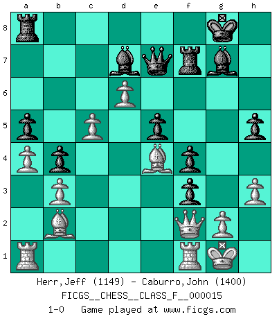 Last move : 1-0 2006 November 21 11:57:55 [Event "FICGS__CHESS__CLASS_F__000015"] [Site "FICGS"] [Date "2006.10.27"] [Round "1"] [White "Herr,Jeff"] [Black "Caburro,John"] [Result "1-0"] [WhiteElo "1149"] [BlackElo "1400"] 1.d4 c5 2.d5 e5 3.e4 d6 4.Nf3 Nf6 5.Nbd2 a6 6.Be2 b5 7.O-O Be7 8.c4 b4 9.b3 O-O 10.Ne1 a5 11.f4 exf4 12.Rxf4 Nbd7 13.Nd3 Ne5 14.Nxe5 dxe5 15.Rf1 Ne8 16.Bb2 Bf6 17.Nf3 Qe7 18.a3 Nd6 19.Bd3 Bd7 20.h3 g6 21.a4 Bg7 22.Nd2 f5 23.Qe2 f4 24.Nf3 g5 25.Qf2 Rf7 26.Qxc5 h5 27.Qf2 g4 28.c5 Nxe4 29.Bxe4 gxf3 30.d6 1-0 Semi-Benoni (`blockade variation') Kingside Castling by player White (move 7) Kingside Castling by player Black (move 9) Player White won this chess game. Follow this game move after move (download)No one ever won a game by resigning. (Unknown) Ich hatte meine größten Erfolge, als ich 47 Jahre alt war. Kasparow war noch nicht mal 42 und hat das Schach schon im Stich gelassen. (Viktor Kortschnoi) Bobby es la celebridad menos entendida y malinterpretada que camina el la faz de esta tierra. (Yasser Seirawan) Le génie consiste à savoir transgresser les règles au moment opportun. (Teichmann) I've lost money so fast in these clubs it's left me reeling. I've read every poker book ever written, but the only way to get better at the game is to go out and play with people who are really good. The problem is, you stand to lose a lot of money doing it. (Matt Damon)