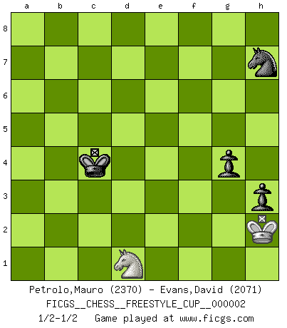 Last move : 1/2-1/2 2010 April 3 18:53:32 [Event "FICGS__CHESS__FREESTYLE_CUP__000002"] [Site "FICGS"] [Date "2010.04.03"] [Round "1"] [White "Petrolo,Mauro"] [Black "Evans,David"] [Result "1/2-1/2"] [WhiteElo "2370"] [BlackElo "2071"] 1.e4 c5 2.Nf3 d6 3.d4 cxd4 4.Nxd4 Nf6 5.Nc3 a6 6.Be3 e6 7.f3 b5 8.g4 b4 9.Nce2 h6 10.c4 e5 11.Nc2 a5 12.Ng3 Nbd7 13.Qd2 Qc7 14.O-O-O Nc5 15.Kb1 Be6 16.h4 Rb8 17.Nf5 b3 18.Na3 bxa2+ 19.Kxa2 Qb7 20.Bxc5 dxc5 21.Kb1 Bxf5 22.gxf5 Qb3 23.Nb5 Be7 24.Bd3 O-O 25.Qxa5 Rb7 26.Qa3 Qxa3 27.bxa3 Ra8 28.Kb2 Nh5 29.Bc2 Nf4 30.a4 Ne2 31.Rd5 Nf4 32.Rd2 h5 33.Rdh2 Kf8 34.Rd1 Rd8 35.Ra1 Ra8 36.Ka2 Bd8 37.Rd1 Ba5 38.R2h1 R7b8 39.Ka3 Rd8 40.Rxd8+ Rxd8 41.Na7 Rd6 42.Kb3 Ng2 43.Nb5 Rd8 44.Rh2 Ne3 45.Rf2 Rd7 46.Bb1 g5 47.fxg6 fxg6 48.f4 Ng4 49.Rf1 exf4 50.Rxf4+ Kg7 51.Bc2 Bd8 52.Rf3 Ne5 53.Rh3 Rd2 54.Bb1 Ba5 55.Bc2 Rf2 56.Bd1 Nc6 57.Bc2 Be1 58.Rh1 Re2 59.Rh3 Na5+ 60.Kb2 Nxc4+ 61.Kb3 Nd2+ 62.Kb2 Nxe4 63.Rd3 Kh6 64.Rd5 Bxh4 65.a5 Bf6+ 66.Kc1 Re1+ 67.Rd1 Bg5+ 68.Kb2 Rxd1 69.Bxd1 Bf4 70.Bf3 Nf2 71.Kc3 Bb8 72.Kd2 Kg5 73.a6 h4 74.Ke2 Ng4 75.a7 Bxa7 76.Nxa7 Kf4 77.Nb5 Nf6 78.Bb7 g5 79.Nc3 Kg3 80.Kf1 Kh2 81.Nb1 g4 82.Nd2 Kg3 83.Kg1 Kf4 84.Bc6 Ke5 85.Nc4+ Kd4 86.Nd6 h3 87.Kh2 Ke5 88.Nf7+ Kf4 89.Nd6 Nh7 90.Ne4 c4 91.Bd5 Ke5 92.Nc3 Kd4 93.Bxc4 Kxc4 94.Nd1 1/2-1/2 Sicilian : Najdorf, Byrne (English) attack Queenside Castling by player White (move 14) Kingside Castling by player Black (move 24) 10 pieces endgame at move 69 : White KBNP , Black KBNPPP WHITE : King + 1 Bishop 1 Knight 1 Pawn BLACK : King + 1 Bishop 1 Knight 3 Pawns 9 pieces endgame at move 75 : White KBN , Black KBNPPP WHITE : King + 1 Bishop 1 Knight BLACK : King + 1 Bishop 1 Knight 3 Pawns 8 pieces endgame at move 76 : White KBN , Black KNPPP WHITE : King + 1 Bishop 1 Knight BLACK : King + 1 Knight 3 Pawns 7 pieces endgame at move 93 : White KBN , Black KNPP WHITE : King + 1 Bishop 1 Knight BLACK : King + 1 Knight 2 Pawns 6 pieces endgame at move 93 : White KN , Black KNPP WHITE : King + 1 Knight BLACK : King + 1 Knight 2 Pawns This chess game ended in a draw. Follow this game move after move (download)The most powerful weapon in Chess is to have the next move. (David Bronstein) Schach ist ein Teil der Kultur, und wenn es mit der Kultur abwärts geht, geht es auch mit dem Schach abwärts. (Mikhail Moiseyevich Botvinik) Aún el Rey más flojo huye despavorido ante la amenaza de un Jaque doble. (Aaron Nimzowitsch) Que feriez-vous si vous étiez en train de jouer aux échecs et que la fin du monde arrive ? Je continuerais à jouer. (Saint Borromée) Always remember that you are unique; just like everyone else. (Unknown)