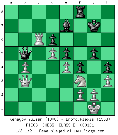 Last move : 1/2-1/2 2010 May 11 21:43:30 [Event "FICGS__CHESS__CLASS_E__000121"] [Site "FICGS"] [Date "2010.04.04"] [Round "1"] [White "Kehayov,Yulian"] [Black "Bromo,Alexis"] [Result "1/2-1/2"] [WhiteElo "1300"] [BlackElo "1363"] 1.e4 e5 2.d4 d6 3.d5 Nf6 4.Bd3 a6 5.Nf3 h6 6.O-O Be7 7.c4 c5 8.a3 b5 9.b3 O-O 10.h3 Nbd7 11.Be3 Bb7 12.Nbd2 Nb6 13.cxb5 axb5 14.Bxb5 Ba6 15.Bxa6 Rxa6 16.Qc1 Nh5 17.b4 cxb4 18.axb4 Rxa1 19.Qxa1 f5 20.Qb1 f4 21.Bxb6 Qxb6 22.Qb2 Ng3 23.Re1 g5 24.Nf1 Nxf1 25.Kxf1 Kg7 26.Rc1 h5 27.Rc6 Qb5+ 28.Kg1 h4 29.Qb3 1/2-1/2 King's pawn game Kingside Castling by player White (move 6) Kingside Castling by player Black (move 9) This chess game ended in a draw. Follow this game move after move (download)I'm not afraid of Spassky. The world knows I'm the best. You don't need a match to prove it. (Bobby Fischer) Der Verteidiger gebe der Gewalt nach, aber nur der Gewalt. Er schaffe sich nicht freiwillig, etwa aus Blindheit oder aus Schrecken, irgendwelche Schwächen. Er lasse sich nicht bluffen. (Emanuel Lasker) El juego del Ajedrez no es solamente una diversión quieta; algunas cualidades muy valuables de la mente se pueden adquirir y cultivar con el, como convertirlos en habitos disponibles para toda ocasión; ya que la vida es algo así como el Ajedrez. (Benjamin Franklin) Le pion, dans sa simplicité, marche droit devant lui, mais lorsqu'il prend, il le fait obliquement? Ainsi l'homme, tant qu'il reste pauvre, marche dans la droiture et vit honnêtement, mais lorsqu'il recherche les honneurs, il flatte, se parjure et, par les voies obliques, cherche une position supérieure sur l'échiquier du monde. (Jean de Galles) I'm extremely disappointed. I send you out for exciting, new designer drugs, you come back with tomato sauce. (Gregory House, House M.D.)