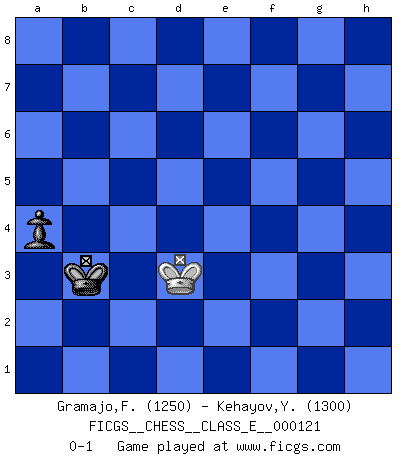 Last move : 0-1 2010 May 27 22:42:24 [Event "FICGS__CHESS__CLASS_E__000121"] [Site "FICGS"] [Date "2010.04.04"] [Round "1"] [White "Gramajo,Francisco"] [Black "Kehayov,Yulian"] [Result "0-1"] [WhiteElo "1250"] [BlackElo "1300"] 1.e4 e5 2.Nf3 d5 3.Nc3 d4 4.Ne2 Bd6 5.d3 Nf6 6.c3 O-O 7.cxd4 Nc6 8.Bg5 Be6 9.d5 Bd7 10.dxc6 Bxc6 11.Ng3 Be7 12.Nxe5 h6 13.Bh4 g5 14.Bxg5 hxg5 15.h4 gxh4 16.Rxh4 Nxe4 17.Qg4+ Ng5 18.O-O-O Bf6 19.Nxc6 bxc6 20.Be2 Re8 21.Rdh1 Kf8 22.Rh8+ Ke7 23.Rxe8+ Kxe8 24.Qc4 Qd7 25.Re1 Be7 26.Bh5 Rd8 27.Ne4 Qxd3 28.Qxc6+ Rd7 29.Nxg5 Qd2+ 30.Kb1 Qxe1+ 31.Kc2 Qd2+ 32.Kb3 Qxg5 33.Bxf7+ Kxf7 34.Qxd7 Qxg2 35.Qf5+ Bf6 36.Qd7+ Be7 37.Qf5+ Bf6 38.a4 Qc6 39.Ka3 Qd6+ 40.b4 Ke7 41.a5 Kd8 42.f4 Be7 43.Qb5 a6 44.Qc4 c5 45.bxc5 Qxc5+ 46.Qxc5 Bxc5+ 47.Ka4 Kd7 48.Kb3 Kd6 49.Kc4 Kc6 50.f5 Be7 51.Kd4 Kb5 52.Ke5 Kxa5 53.f6 Bxf6+ 54.Kxf6 Kb4 55.Ke5 a5 56.Kd4 Kb3 57.Kd3 a4 0-1 QP counter-gambit (elephant gambit) Kingside Castling by player Black (move 6) Queenside Castling by player White (move 18) 10 pieces endgame at move 34 : White KQPPP , Black KQBPP WHITE : King + 1 Queen 3 Pawns BLACK : King + 1 Queen 1 Bishop 2 Pawns 9 pieces endgame at move 45 : White KQPPP , Black KQBP WHITE : King + 1 Queen 3 Pawns BLACK : King + 1 Queen 1 Bishop 1 Pawn 8 pieces endgame at move 45 : White KQPP , Black KQBP WHITE : King + 1 Queen 2 Pawns BLACK : King + 1 Queen 1 Bishop 1 Pawn 7 pieces endgame at move 46 : White KQPP , Black KBP WHITE : King + 1 Queen 2 Pawns BLACK : King + 1 Bishop 1 Pawn 6 pieces endgame at move 46 : White KPP , Black KBP WHITE : King + 2 Pawns BLACK : King + 1 Bishop 1 Pawn 5 pieces endgame at move 52 : White KP , Black KBP WHITE : King + 1 Pawn BLACK : King + 1 Bishop 1 Pawn 4 pieces endgame at move 53 : White K , Black KBP WHITE : King + BLACK : King + 1 Bishop 1 Pawn 3 pieces endgame at move 54 : White K , Black KP WHITE : King + BLACK : King + 1 Pawn Player Black won this chess game. Follow this game move after move (download)When in doubt... play Chess ! (Tevis) Bogoljubow: Matt in vier Zügen! Tartakower: Ich verbitte mir jede Belästigung! (Savielly Grigorievitsch Tartakower) Aquel que ve no otra dirección en el juego que la de dar Jaque Mate a su oponente, nunca será un buen jugador de Ajedrez. (Euwe) Je fais ceci parce que dans cinquante coups j'obtiendrai cela; je m'appelle Mikhail Moisevitch Botvinnik. (Botvinnik) All men can see these tactics whereby I conquer, but what none can see is the strategy out of which victory is evolved. (Sun Tzu)