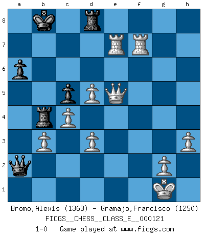 Last move : 1-0 2010 May 9 23:18:18 [Event "FICGS__CHESS__CLASS_E__000121"] [Site "FICGS"] [Date "2010.04.04"] [Round "1"] [White "Bromo,Alexis"] [Black "Gramajo,Francisco"] [Result "1-0"] [WhiteElo "1363"] [BlackElo "1250"] 1.e4 e5 2.Nf3 d6 3.Bc4 h6 4.O-O Bg4 5.h3 Bh5 6.Nc3 Bxf3 7.Qxf3 Nf6 8.d3 c6 9.Be3 b5 10.Bb3 c5 11.a3 a6 12.Nd5 Nbd7 13.c4 Nxd5 14.exd5 Rb8 15.Ba2 b4 16.axb4 Rxb4 17.b3 Be7 18.Qg3 Nf6 19.f4 exf4 20.Bxf4 Nh5 21.Qg4 g6 22.Rae1 Nxf4 23.Qxf4 Kd7 24.Qxf7 Re8 25.Qxg6 Rg8 26.Qxh6 Qa5 27.Rxe7+ Kc8 28.Qxd6 Rd8 29.Qe6+ Kb8 30.R1f7 Qxa2 31.Qe5+ 1-0 Philidor's defense Kingside Castling by player White (move 4) Player White won this chess game. Follow this game move after move (download)The stomach is an essential part of the Chess master. (Bent Larsen) Über Karpov: Er war und ist ein Vertreter der russischen Reaktionäre. Das steckt tief in seiner Seele, wehalb ich nicht nett mit ihm umgehen kann. (Viktor Kortschnoi) Por tratar de evitar la pérdida de una pieza, muchas personas han perdido una partida de Ajedrez. (Savielly Tartakover) Horreur, mais aussi harmonie suprême : qu'y avait-il en effet au monde en dehors des échecs ? Le brouillard, l'inconnu, le non-être... (Vladimir Nabokov) There's no money in correspondence chess. (John Knudsen)