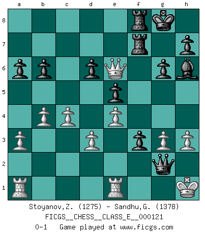 Last move : 0-1 2010 April 16 21:19:48 [Event "FICGS__CHESS__CLASS_E__000121"] [Site "FICGS"] [Date "2010.04.04"] [Round "1"] [White "Stoyanov,Zdravko"] [Black "Sandhu,Gobinder"] [Result "0-1"] [WhiteElo "1275"] [BlackElo "1378"] 1.e4 e5 2.Nf3 Nc6 3.Bb5 Nge7 4.O-O g6 5.d3 Bg7 6.Re1 O-O 7.Bg5 f6 8.Bh4 d6 9.Nc3 a6 10.Bxc6 Nxc6 11.Nd5 Bg4 12.h3 Be6 13.Nc3 Qd7 14.Kh2 Ne7 15.a3 f5 16.Ng5 f4 17.Nxe6 Qxe6 18.Bxe7 Qxe7 19.Qg4 Rf7 20.Nd5 Qd8 21.c4 c6 22.Nc3 Qe7 23.Na4 Raf8 24.Nb6 f3 25.g3 Bh6 26.Nc8 Qc7 27.Na7 b6 28.Nxc6 Qxc6 29.Qe6 Qc5 30.b4 Qxf2+ 31.Kh1 Qg2+ 0-1 Ruy Lopez : Cozio defense Kingside Castling by player White (move 4) Kingside Castling by player Black (move 6) Player Black won this chess game. Follow this game move after move (download)Chess is a beautiful mistress. (Bent Larsen) Schachspieler können ausgezeichnet Varianten am Schachbrett berechnen, aber nicht im realen Leben. Zu stark ist der Individualismus im Schach ausgeprägt, und für viele ist ein kleiner momentaner persönlicher Vorteil wichtiger als ein weit größerer Vorteil von morgen. (Anatoly Karpov) Los Peones son nacidos libres, y aún así, se encuentran encadenados por todos lados. (Rick Kennedy) Si je n'étais pas joueur d'échecs, je serais le meilleur dans quelque chose d'autre. (Anatoli Karpov) A journey of a thousand sites begins with a single click. (Author unknown)
