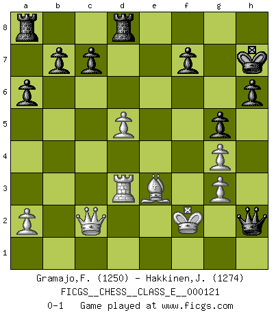 Last move : 0-1 2010 April 6 9:8:46 [Event "FICGS__CHESS__CLASS_E__000121"] [Site "FICGS"] [Date "2010.04.04"] [Round "1"] [White "Gramajo,Francisco"] [Black "Hakkinen,Jorma"] [Result "0-1"] [WhiteElo "1250"] [BlackElo "1274"] 1.h3 e5 2.e4 Nc6 3.Bb5 Nf6 4.d3 h6 5.Nf3 Bc5 6.c3 a6 7.Bxc6 dxc6 8.Nxe5 O-O 9.Ng4 Nxg4 10.hxg4 Qf6 11.f3 g5 12.d4 Bb6 13.c4 c5 14.d5 Ba5+ 15.Nc3 Bxc3+ 16.bxc3 Qxc3+ 17.Bd2 Qxc4 18.Rc1 Qd4 19.Rc3 Kh7 20.Qc2 Kg7 21.Be3 Qe5 22.Bxc5 Rd8 23.Rd3 Kh7 24.g3 Bxg4 25.fxg4 Qxe4+ 26.Be3 Qxh1+ 27.Kf2 Qh2+ 0-1 Clemenz (Mead's, Basman's or de Klerk's) Opening Kingside Castling by player Black (move 8) Player Black won this chess game. Follow this game move after move (download)There are tough players and nice guys, and I'm a tough player. (Bobby Fischer) Wenn du nicht weißt was du tun sollst, warte bis dein Gegner eine Idee hat. Sie wird sicher schlecht sein. (Siegbert Tarrasch) No hay precio que no valga la pena por la cabellera del Rey enemigo. (Koblentz) Toutes les manuvres exécutées sur une colonne ouverte ont pour but ultime l'intrusion définitive sur la septième ou la huitième rangée, en plein cur de la position ennemie. (Aaron Nimzovitch) Shallow men believe in luck. Strong men belive in cause and effect. (Ralph Waldo Emerson)