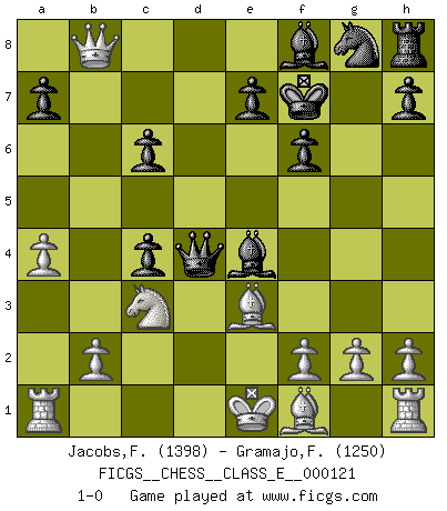 Last move : 1-0 2010 April 12 23:46:41 [Event "FICGS__CHESS__CLASS_E__000121"] [Site "FICGS"] [Date "2010.04.04"] [Round "1"] [White "Jacobs,Francois"] [Black "Gramajo,Francisco"] [Result "1-0"] [WhiteElo "1398"] [BlackElo "1250"] 1.d4 d5 2.c4 dxc4 3.Nf3 Bg4 4.Ne5 Be6 5.e4 b5 6.a4 f6 7.Qh5+ g6 8.Nxg6 Bf7 9.Qxb5+ c6 10.Qb7 Bxg6 11.Qxa8 Qxd4 12.Qxb8+ Kf7 13.Nc3 Bxe4 14.Be3 1-0 QGA : 3.Nf3 Player White won this chess game. Follow this game move after move (download)You must take your opponent into a deep dark forest where 2+2=5, and the path leading out is only wide enough for one. (Mikhail Tal) Ich tröste mich mit dem Vergnügen, daß Schachfans, Zuschauer und Leser glücklich sind, wenn ein Großmeister etwas riskiert, statt nur Klötzchen zu schieben. (Mikhail Nekhemyevich Tal) Un jugador que trata de regresar una movida en el Ajedrez es un futuro carterista. (Richard Fenton) Il n'y a pas de prix trop élevé au scalp de l'ennemi. (Koblentz) Art disturbs, science reassures. (Georges Braque, Le Jour et la Nuit)