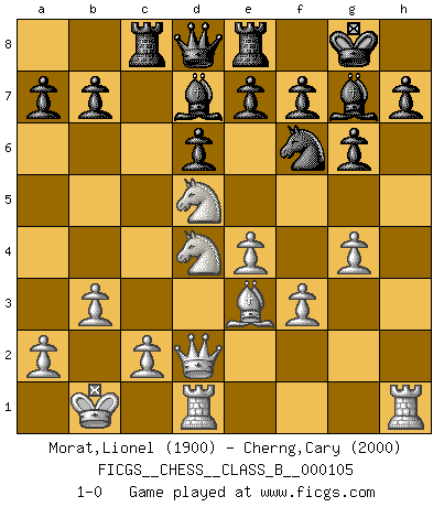 Last move : 1-0 2010 April 13 20:46:5 [Event "FICGS__CHESS__CLASS_B__000105"] [Site "FICGS"] [Date "2010.04.04"] [Round "1"] [White "Morat,Lionel"] [Black "Cherng,Cary"] [Result "1-0"] [WhiteElo "1900"] [BlackElo "2000"] 1.e4 c5 2.Nf3 d6 3.d4 cxd4 4.Nxd4 Nf6 5.Nc3 g6 6.Be3 Bg7 7.f3 Nc6 8.Qd2 O-O 9.Bc4 Bd7 10.O-O-O Rc8 11.Bb3 Ne5 12.h4 Nc4 13.Bxc4 Rxc4 14.h5 Nxh5 15.g4 Nf6 16.Kb1 Re8 17.b3 Rc8 18.Nd5 1-0 Sicilian : Dragon, Yugoslav attack Kingside Castling by player Black (move 8) Queenside Castling by player White (move 10) Player White won this chess game. Follow this game move after move (download)In order to improve your game, you must study the endgame before everything else, for whereas the endings can be studied and mastered by themselves, the middle game and the opening must be studied in relation to the endgame. (Jose Raul Capablanca) Wenn es im Universum noch irgendwo intelligente Lebewesen gibt, dann kennen sie Go. (Emanuel Lasker) Personalmente, yo prefiero mirar hacia el futuro en donde un programa de computadora gane el título mundial de Ajedrez. La humanidad necesita una lección de humildad. (Richard Dawkings) Il (Jacob Murray) ne joue pas pour le bon coup, mais pour le meilleur. (Eloi Relange) A belief is an idea the mind possesses, an idea that possesses the mind. (Robert Oxden Bolton)