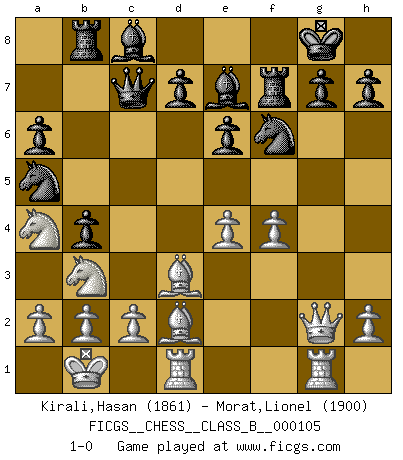 Last move : 1-0 2010 August 27 22:50:2 [Event "FICGS__CHESS__CLASS_B__000105"] [Site "FICGS"] [Date "2010.04.04"] [Round "1"] [White "Kirali,Hasan"] [Black "Morat,Lionel"] [Result "1-0"] [WhiteElo "1861"] [BlackElo "1900"] 1.e4 c5 2.Nf3 e6 3.d4 cxd4 4.Nxd4 Nc6 5.Nc3 Qc7 6.Be3 a6 7.Qd2 Nf6 8.O-O-O Bb4 9.f3 Ne5 10.Nb3 b5 11.Qd4 Nc6 12.Qb6 Qe5 13.Bd2 Rb8 14.Qf2 O-O 15.g4 Qc7 16.Kb1 Be7 17.Rg1 Ne8 18.g5 f5 19.gxf6 Nxf6 20.f4 b4 21.Qg2 Rf7 22.Na4 Na5 23.Bd3 1-0 Sicilian : Taimanov variation Queenside Castling by player White (move 8) Kingside Castling by player Black (move 14) Player White won this chess game. Follow this game move after move (download)We don't really know how the game was invented, though there are suspicions. As soon as we discover the culprits, we'll let you know. (Bruce Pandolfini) Bobby Fischer ist kein Vorbild für die heutige Jugend. (Viktor Kortschnoi) El Ajedrez lo es todo: arte, ciencia y deporte. (Anatoly Karpov) Même si l'adversaire joue le coup analysé précédemment, recommencez l'analyse en voyant la nouvelle position. Première règle de Blumenfeld Sometimes it pays to stay in bed in Monday, rather than spending the rest of the week debugging Monday's code. (Dan Salomon)
