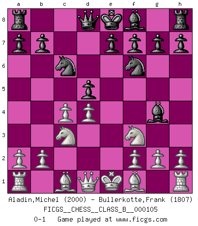 Last move : 0-1 2010 May 21 20:26:40 [Event "FICGS__CHESS__CLASS_B__000105"] [Site "FICGS"] [Date "2010.04.04"] [Round "1"] [White "Aladin,Michel"] [Black "Bullerkotte,Frank"] [Result "0-1"] [WhiteElo "2000"] [BlackElo "1807"] 1.e4 c6 2.d4 d5 3.exd5 cxd5 4.c4 Nf6 5.Nc3 Nc6 6.Nf3 Bg4 0-1 This chess game has been lost on time (started : 2010.04.04 3:24:0) Caro-Kann : Panov-Botvinnik attack Player Black won this chess game. Follow this game move after move (download)Man is a frivolous, a specious creature, and like a Chess player, cares more for the process of attaining his goal than for the goal itself. (Dostoyevsky) Sehr viele beherrschen heutzutage das große Einmalseins des Schachspiels und kennen sogar dessen Logarithmentafeln auswendig - deshalb sollte man hin und wieder zu beweisen trachten, dass zwei mal zwei auch fünf sein kann. (Mikhail Nekhemyevich Tal) El Ajedrez es un regaderazo frío para la mente. (Sir John Simon) Il vaut mieux sacrifier les pièces de l'adversaire. (Xavier Tartacover) If passion drives you, let reason holds the reins. (Benjamin Franklin)