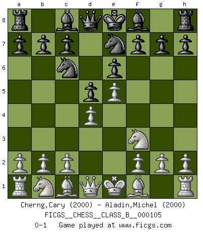 Last move : 0-1 2010 June 4 21:0:14 [Event "FICGS__CHESS__CLASS_B__000105"] [Site "FICGS"] [Date "2010.04.04"] [Round "1"] [White "Cherng,Cary"] [Black "Aladin,Michel"] [Result "0-1"] [WhiteElo "2000"] [BlackElo "2000"] 1.e4 Nc6 2.Nf3 e6 3.d4 d5 4.e5 Nge7 0-1 This chess game has been lost on time (started : 2010.04.04 3:24:0) KP : Nimzovich defense Player Black won this chess game. Follow this game move after move (download)Bobby is the finest Chess player this country ever produced. His memory for the moves, his brilliance in dreaming up combinations, and his fierce determination to win are uncanny. (John Collins) Jede Eröffnung ist gut genug um gespielt zu werden, wenn nur ihr Ruf schlecht genug ist. (Savielly Grigorievitsch Tartakower) Cuando estes solo, cuando te sientas un extraño en el mundo, juega al Ajedrez. Esto levantará tu espiritu y será tu consejero de guerra. (Aristóteles) Je ne suis pas le dernier à jouer lâchement des coups douteux pendant le zeïtnot de l'adversaire pour l'achever: en effet les coups qui font le plus peur sont ceux que l'on ne comprend pas. Je me fais souvent peur quand je joue. (Un professeur anonyme) The difference between stupidity and genius is that genius has its limits. (Murphy)