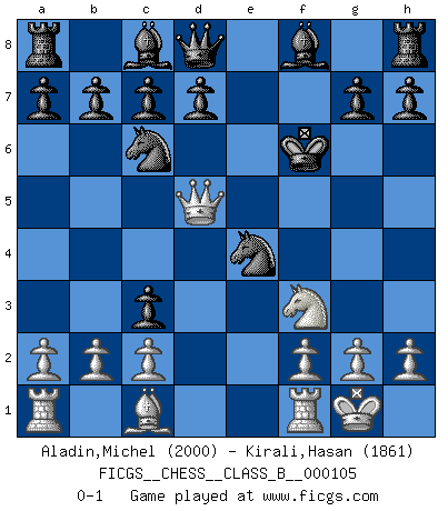 Last move : 0-1 2010 June 7 9:18:48 [Event "FICGS__CHESS__CLASS_B__000105"] [Site "FICGS"] [Date "2010.04.04"] [Round "1"] [White "Aladin,Michel"] [Black "Kirali,Hasan"] [Result "0-1"] [WhiteElo "2000"] [BlackElo "1861"] 1.e4 e5 2.Bc4 Nf6 3.d4 exd4 4.Nf3 Nc6 5.O-O Nxe4 6.Nc3 dxc3 7.Bxf7+ Kxf7 8.Qd5+ Kf6 0-1 This chess game has been lost on time (started : 2010.04.04 3:24:0) Bishop's Opening : Urusov gambit Kingside Castling by player White (move 5) Player Black won this chess game. Follow this game move after move (download)A Chess game is a dialogue, a conversation between a player and his opponent. Each move by the opponent may contain threats or be a blunder, but a player cannot defend against threats or take advantage of blunders if he does not first ask himself: What is my opponent planning after each move ? (Bruce A. Moon) Karpov ist ein Museumsstück. (Garry Kasparov) ¡Examina movidas que hagan daño! Un buen ojo for movidas desvastantes es mucho mas importante que el conocimiento de principios estratégicos. (Purdy) Aux échecs, l'amour-propre est satisfait quand on remporte la victoire, mais il n'y a pas de honte à être battu. (Benjamin Franklin) Without enthusiasm, virtue functions not at all, and vice only poorly. (Mignon McLaughlin, The Neurotic's Notebook, 1960)
