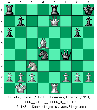 Last move : 1/2-1/2 2010 May 21 15:32:49 [Event "FICGS__CHESS__CLASS_B__000105"] [Site "FICGS"] [Date "2010.04.04"] [Round "1"] [White "Kirali,Hasan"] [Black "Freeman,Thomas"] [Result "1/2-1/2"] [WhiteElo "1861"] [BlackElo "1910"] 1.e4 g6 2.d4 Bg7 3.Be3 c5 4.Nc3 cxd4 5.Bxd4 Nf6 6.e5 Nh5 7.Qd2 d6 8.exd6 Qxd6 9.Nf3 Nc6 10.Nb5 Qb8 11.Bxg7 Nxg7 12.O-O-O O-O 13.Bc4 Bg4 14.Bd5 Rd8 15.Qe3 Nf5 16.Qe4 Bxf3 17.Qxf3 a6 18.Nc3 Ncd4 19.Rxd4 Nxd4 20.Qxf7+ Kh8 21.Re1 Rf8 22.Qxe7 Qf4+ 23.Kb1 Rfe8 1/2-1/2 Robatsch (Modern) defense Queenside Castling by player White (move 12) Kingside Castling by player Black (move 12) This chess game ended in a draw. Follow this game move after move (download)With or without the title, Bobby Fischer was unquestionably the greatest player of his time. (Burt Hochberg) Schach ist eine Sache der genauen Beurteilung, wann man zuschlagen und wann man sich ducken muss. (Robert James Fischer) Ciertamente el estado mental actual de Bobby Fischer es una tragedia. Uno de los mas grandes jugadores de Ajedrez del mundo -el orgullo y pena del Ajedrez Americano. (Frank Brady) La tactique, c'est ce que vous faites quand il y a quelque chose à faire; la stratégie, c'est ce que vous faites quand il n'y a rien à faire. (Savielli Tartacower) Every now and then a man's mind is stretched by a new idea and never shrinks back to its former dimensions. (Oliver Wendell Holmes, Sr.)