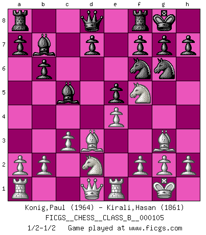 Last move : 1/2-1/2 2010 June 1 21:54:50 [Event "FICGS__CHESS__CLASS_B__000105"] [Site "FICGS"] [Date "2010.04.04"] [Round "1"] [White "Konig,Paul"] [Black "Kirali,Hasan"] [Result "1/2-1/2"] [WhiteElo "1964"] [BlackElo "1861"] 1.e4 b6 2.d4 Bb7 3.Bd3 e6 4.Nf3 c5 5.O-O cxd4 6.Nxd4 Nc6 7.Be3 Nf6 8.Nd2 Ne5 9.Bf4 Ng6 10.Bg3 Bc5 11.c3 O-O 12.Re1 e5 13.Nf5 1/2-1/2 Owen defense Kingside Castling by player White (move 5) Kingside Castling by player Black (move 11) This chess game ended in a draw. Follow this game move after move (download)Botvinnik tried to take the mystery out of Chess, always relating it to situations in ordinary life. He used to call Chess a typical inexact problem similar to those which people are always having to solve in everyday life. (Garry Kasparov) Über Karpov: Er war und ist ein Vertreter der russischen Reaktionäre. Das steckt tief in seiner Seele, wehalb ich nicht nett mit ihm umgehen kann. (Viktor Kortschnoi) Siempre es mejor sacrificar los hombres de tu oponente. (Savielly Tartakower) Le pion, dans sa simplicité, marche droit devant lui, mais lorsqu'il prend, il le fait obliquement? Ainsi l'homme, tant qu'il reste pauvre, marche dans la droiture et vit honnêtement, mais lorsqu'il recherche les honneurs, il flatte, se parjure et, par les voies obliques, cherche une position supérieure sur l'échiquier du monde. (Jean de Galles) Tomorrow's what you make of it. (Horatio Caine, C.S.I. Miami)