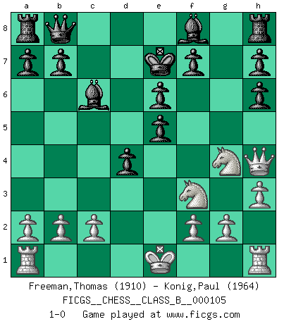 Last move : 1-0 2010 May 14 0:28:27 [Event "FICGS__CHESS__CLASS_B__000105"] [Site "FICGS"] [Date "2010.04.04"] [Round "1"] [White "Freeman,Thomas"] [Black "Konig,Paul"] [Result "1-0"] [WhiteElo "1910"] [BlackElo "1964"] 1.e4 c5 2.Nf3 Nc6 3.Nc3 Nf6 4.e5 Ng4 5.Qe2 Qc7 6.Nd5 Qb8 7.d4 cxd4 8.Bf4 e6 9.h3 Nh6 10.Bxh6 gxh6 11.Nf6+ Ke7 12.Qe4 d6 13.Qh4 dxe5 14.Bb5 Bd7 15.Bxc6 Bxc6 16.Ng4 1-0 Sicilian defense Player White won this chess game. Follow this game move after move (download)Life is a kind of Chess, with struggle, competition, good and ill events. (Benjamin Franklin) Ein bischen Romantik kann weder im Schach noch in der Liebe schaden. Also versuche ich mich ab und zu daran zu erinnern. (Nigel Short) Durante una competencia de Ajedrez, un Maestro de Ajedrez deberá ser una combinación de presa de caza y un Monge. (Alexander Alekhine) Les Echecs, c'est l'art de la guerre sans les charniers, c'est la résurrection des morts tombés au champ d'honneur, l'espoir perpétuel, la suprématie de l'intelligence sur la force, la culture de l'esprit. (F. Szpiner) The large trees attract high winds. (Chinese proverb)
