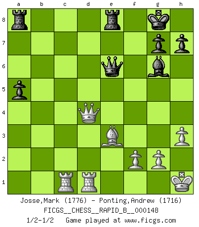 Last move : 1/2-1/2 2010 June 9 10:2:3 [Event "FICGS__CHESS__RAPID_B__000148"] [Site "FICGS"] [Date "2010.04.05"] [Round "1"] [White "Josse,Mark"] [Black "Ponting,Andrew"] [Result "1/2-1/2"] [WhiteElo "1776"] [BlackElo "1716"] 1.e4 e5 2.Nf3 Nc6 3.Bb5 Nf6 4.Bxc6 dxc6 5.d3 Bd6 6.O-O c5 7.b3 O-O 8.Na3 Re8 9.Nc4 b5 10.Ne3 Ng4 11.a4 c6 12.h3 Nxe3 13.Bxe3 a6 14.Kh1 f5 15.exf5 Bxf5 16.Nd2 Qd7 17.Qf3 Rf8 18.Ne4 c4 19.axb5 cxb5 20.bxc4 bxc4 21.Rfd1 Bg6 22.Qe2 cxd3 23.cxd3 a5 24.Nxd6 Qxd6 25.Rac1 Rfe8 26.d4 exd4 27.Qc4+ Qe6 28.Qxd4 1/2-1/2 Ruy Lopez : Berlin defense Kingside Castling by player White (move 6) Kingside Castling by player Black (move 7) This chess game ended in a draw. Follow this game move after move (download)Chess is imagination. (David Bronstein) Über Frauen: Chess is better. (Robert James Fischer) Las leyes del Ajedrez no permiten una libre elección: tienes que mover quieras o no. (Emanuel Lasker) On est toujours la mazette de quelqu'un d'autre. (Anonyme) Luck has a peculiar habit of favoring those who don't depend on it. (Author unknown)