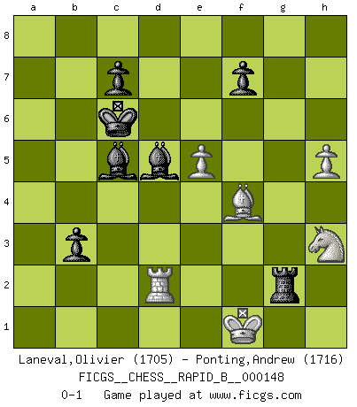 Last move : 0-1 2010 June 29 10:7:18 [Event "FICGS__CHESS__RAPID_B__000148"] [Site "FICGS"] [Date "2010.04.05"] [Round "1"] [White "Laneval,Olivier"] [Black "Ponting,Andrew"] [Result "0-1"] [WhiteElo "1705"] [BlackElo "1716"] 1.e4 e5 2.Nf3 Nc6 3.Bb5 Nf6 4.O-O Nxe4 5.d4 Nd6 6.Bxc6 dxc6 7.dxe5 Nf5 8.Qxd8+ Kxd8 9.Nc3 h6 10.Rd1+ Ke8 11.Ne2 Ne7 12.h3 Ng6 13.Be3 c5 14.Nf4 Nxf4 15.Bxf4 Be6 16.a3 Rd8 17.Be3 Be7 18.Nd2 Kd7 19.Ne4 Kc6 20.Rd3 b6 21.Rc3 Kb7 22.a4 g5 23.a5 Rd5 24.axb6 axb6 25.f4 gxf4 26.Bxf4 Rd4 27.Re3 Rb4 28.b3 c4 29.bxc4 Rxc4 30.c3 Bd5 31.Rae1 Ra8 32.Bxh6 Ra2 33.Nf2 Bc5 34.R3e2 Rxe2 35.Rxe2 Rxc3 36.h4 Rg3 37.Rd2 Rxg2+ 38.Kf1 Kc6 39.Bf4 b5 40.h5 b4 41.Nh3 b3 0-1 Ruy Lopez : Berlin defense, Open variation Kingside Castling by player White (move 4) Player Black won this chess game. Follow this game move after move (download)When I have White, I win because I am white; When I have Black, I win because I am Bogolyubov. (Bogolyubov) Der Traum, für den ich lebe, ist der von einem freien Russland. Viele mögen sagen: Russland hat doch ein Parlament, einen gewählten Präsidenten. Aber ich spüre, dass in meiner Heimat die Angst wiederkehrt. Eine Angst, sich frei zu äußern, bestimmte Dinge zu tun (Garry Kasparov) Los Peones son el alma de una partida de Ajedrez. (Francois Andre Danican Philidor) C'est la seule position que je connaisse où les deux camps sont mals. Propos prêtés à V. Anand. 98% of all statistics are made up. (Author unknown)