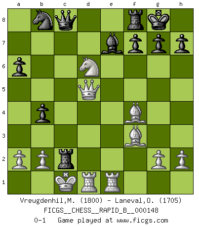 Last move : 0-1 2010 June 9 9:27:11 [Event "FICGS__CHESS__RAPID_B__000148"] [Site "FICGS"] [Date "2010.04.05"] [Round "1"] [White "Vreugdenhil,Maarten"] [Black "Laneval,Olivier"] [Result "0-1"] [WhiteElo "1800"] [BlackElo "1705"] 1.e4 c5 2.Nf3 d6 3.d4 cxd4 4.Nxd4 Nf6 5.Nc3 a6 6.Be2 e5 7.Nb3 Be7 8.Be3 Be6 9.f4 exf4 10.Bxf4 b5 11.Nd4 b4 12.Nd5 Bxd5 13.exd5 Nxd5 14.Bf3 Qa5 15.Nb3 Qb6 16.Qxd5 Ra7 17.O-O-O O-O 18.Rhe1 Qd8 19.Na5 Rc7 20.Nb7 Qc8 21.Nxd6 Rxc2+ 0-1 This chess game has been lost on time (started : 2010.04.05 4:55:59) Sicilian : Najdorf, Opovcensky variation Queenside Castling by player White (move 17) Kingside Castling by player Black (move 17) Player Black won this chess game. Follow this game move after move (download)There is no remorse like the remorse of Chess. (H. G. Wells) Spielt Blackmar-Diemer-Gambit, und das Matt kommt von selbst! (Emil Joseph Diemer) No solamente yo pronostico su triunfo sobre Botvinnik, sino que me adelanto y digo que probablemente Fischer es el jugador de Ajedrez mas grande que haya existido. (John Collins) Les échecs sont un jeu par leur forme, un art par leur essence et une science par sa difficulté d'acquisition. Ils peuvent vous procurer autant de plaisir qu'un bon livre ou une belle musique, mais vous n'aurez une réelle joie que si vous arrivez à bien jouer. (Tigran Petrosian) When you have everything, sometimes it feels like nothing. (Horatio Caine, C.S.I. Miami)