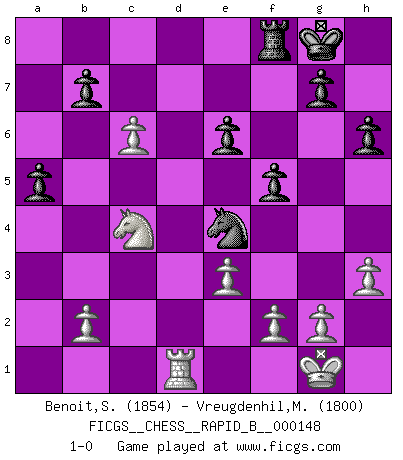 Last move : 1-0 2010 June 10 9:28:35 [Event "FICGS__CHESS__RAPID_B__000148"] [Site "FICGS"] [Date "2010.04.05"] [Round "1"] [White "Benoit,Sebastien"] [Black "Vreugdenhil,Maarten"] [Result "1-0"] [WhiteElo "1854"] [BlackElo "1800"] 1.d4 Nf6 2.Nf3 d5 3.c4 e6 4.Nc3 Nc6 5.Bg5 Be7 6.e3 O-O 7.Rc1 h6 8.Bh4 a5 9.a3 Ne4 10.Bxe7 Nxe7 11.Bd3 Nxc3 12.Rxc3 dxc4 13.Bxc4 Qd6 14.O-O Bd7 15.Ne5 Nd5 16.Rc1 Be8 17.Bd3 f6 18.Nc4 Qa6 19.Qf3 Bb5 20.Rfd1 Rad8 21.Qg3 f5 22.h3 c5 23.dxc5 Nf6 24.Qh4 Rd5 25.a4 Bxa4 26.Ne5 Bb5 27.Bxb5 Rxd1+ 28.Rxd1 Qxb5 29.Qc4 Qxc4 30.Nxc4 Ne4 31.c6 1-0 This chess game has been lost on time (started : 2010.04.05 4:55:59) Queen's pawn game Kingside Castling by player Black (move 6) Kingside Castling by player White (move 14) Player White won this chess game. Follow this game move after move (download)My God, Bobby Fischer plays so simply. (Alexei Suetin) Ich verstehe den Grund nicht, warum die Aufteilung in Frauen und Männer überhaupt im Schach besteht. (Judith Polgar) No existe un remordimiento como el remordimiento del Ajedrez. (H. G. Wells) Les sacrifices démontrent seulement que quelqu'un a gaffé. (Savielly Tartacover) The human is the only animal species whose members are able to talk themselves into difficulties that would not otherwise exist. (Wendell Johnson)