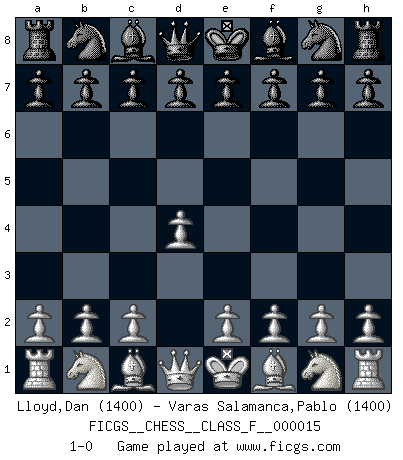 Last move : 1-0 2006 December 6 23:13:54 [Event "FICGS__CHESS__CLASS_F__000015"] [Site "FICGS"] [Date "2006.10.27"] [Round "1"] [White "Lloyd,Dan"] [Black "Varas Salamanca,Pablo"] [Result "1-0"] [WhiteElo "1400"] [BlackElo "1400"] 1.d4 1-0 This chess game has been lost on time (started : 2006.10.27 15:55:49) Queen's pawn Player White won this chess game. Follow this game move after move (download)The stomach is an essential part of the Chess master. (Bent Larsen) Drei Punkte vor allen anderen ist wie einer, der im weißen Anzug posiert, während der Rest in Müllsäcke gekleidet dasteht. (Viktor Kortschnoi) Todo lo que importa ante el tablero de Ajedrez son buenas jugadas. (Bobby Fischer) C'est une question de caractère, Beaucoup de gens perdent leur motivation très vite. D'autres, ils sont rares, peuvent la conserver très longtemps. J'aime les échecs, encore aujourd'hui je suis heureux d'analyser des parties. J'aime toujours gagner, je déteste encore perdre. Bien jouer est important pour mon intégrité intellectuelle et morale. Et puis les échecs vivent en ce moment une période historique grâce à Internet. Ils se développent dans les systèmes éducatifs à travers le monde. Ils sortent de leur ghetto, et c'est mon rôle de mener à bien cette révolution. (Gary Kasparov) Life is pleasant. Death is peaceful. It's the transition that's troublesome. (Isaac Asimov)