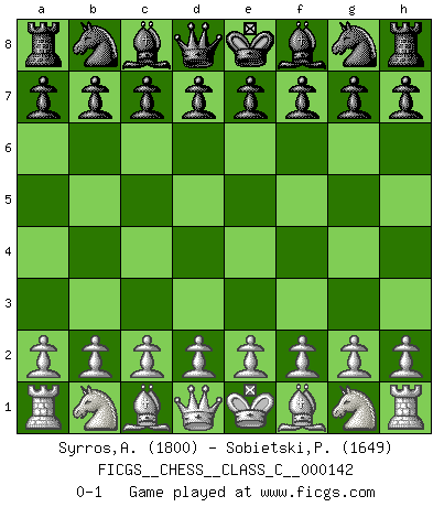 Last move : 0-1 2010 May 18 8:24:16 [Event "FICGS__CHESS__CLASS_C__000142"] [Site "FICGS"] [Date "2010.04.05"] [Round "1"] [White "Syrros,Apostolos"] [Black "Sobietski,Piotr"] [Result "0-1"] [WhiteElo "1800"] [BlackElo "1649"] 0-1 This chess game has been lost on time (started : 2010.04.05 16:5:29) Player Black won this chess game. Follow this game move after move (download)Suddenly it was obvious to me in my analysis I had missed what Fischer had found with the greatest of ease at the board. (Mikhail Botvinnik) Der vorletzte Fehler gewinnt. (Savielly Grigorievitsch Tartakower) Haz el enroque temprano y seguido. (Rob Sillars) A ce moment-là, je menaçais de comprendre la position ! (Clément L'Heureux) Watch your thoughts; they become words. Watch your words; they become actions. Watch your actions; they become habits. Watch your habits; they become character. Watch your character; it becomes your destiny. (Frank Outlaw)