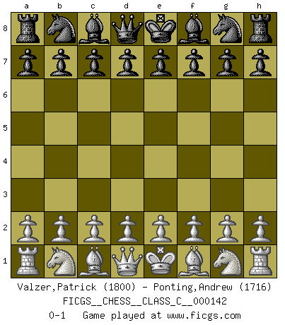 Last move : 0-1 2010 May 18 8:24:16 [Event "FICGS__CHESS__CLASS_C__000142"] [Site "FICGS"] [Date "2010.04.05"] [Round "1"] [White "Valzer,Patrick"] [Black "Ponting,Andrew"] [Result "0-1"] [WhiteElo "1800"] [BlackElo "1716"] 0-1 This chess game has been lost on time (started : 2010.04.05 16:5:29) Player Black won this chess game. Follow this game move after move (download)I had a toothache during the first game. In the second game I had a headache. In the third game it was an attack of rheumatism. In the fourth game, I wasn't feeling well. And in the fifth game? Well, must one have to win every game ? (Siegbert Tarrasch) Drei Punkte vor allen anderen ist wie einer, der im weißen Anzug posiert, während der Rest in Müllsäcke gekleidet dasteht. (Viktor Kortschnoi) En un gambito tu regalas un Peón por el bién de tomar un juego perdido. (Samuel Standige Boden) Il n'y a pas eu de défaite parce que je ne crois pas que cet ordinateur ait jamais existé. IBM a triché en refusant d'imprimer les modes de recherche de la machine. C'est évident, pendant le match, des coups décisifs ont été joués par des êtres humains. Aujourd'hui, les meilleurs spécialistes en informatique ne peuvent toujours pas expliquer comment Deep-Blue a pu jouer contre la logique des ordinateurs. IBM a gagné une guerre de communication, mais ils sont incapables de prouver que l'ordinateur a gagné tout seul. (Garry Kasparov) If you are good, you will be assigned all the work. If you are really good, you will get out of it. (Dan Rotaru)